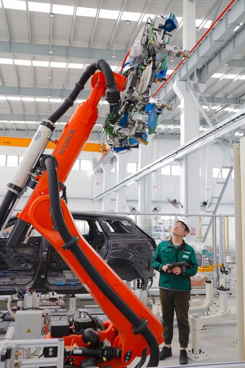 苏俊杰和王楷站在FFT工厂的H25项目前,检视着眼前“工位”的运转。按钮按下,运载机器人身负两扇车门缓缓驶入、停靠。运动轨迹上布满二维码,借以录入坐标信息。两只高约3米的六轴机械臂猛地向下,扭动、旋转、翻腾,瞬间完成物料抓取、位移推送、精准拧紧等工序,又炫技般地将其拆卸、回位。几分钟的时间内,一装一卸,仿佛什么也没发生。