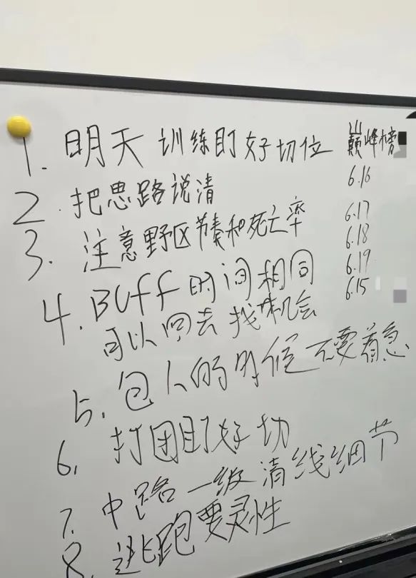 上午11点,穿着队服的Fly出现在一队的房间,开始当日的个人排位练习,操练尚未熟悉的英雄。下午2点到晚上10点是战队训练赛。要么邀约联盟的其他队伍,要么是一队和二队的内部对抗。二队就在隔壁,但训练永远在线上,除非是打乒乓,那是为了提升专注度和协调性。白板上写满了战术提示,诸如草丛危机意识、打不过换线等。