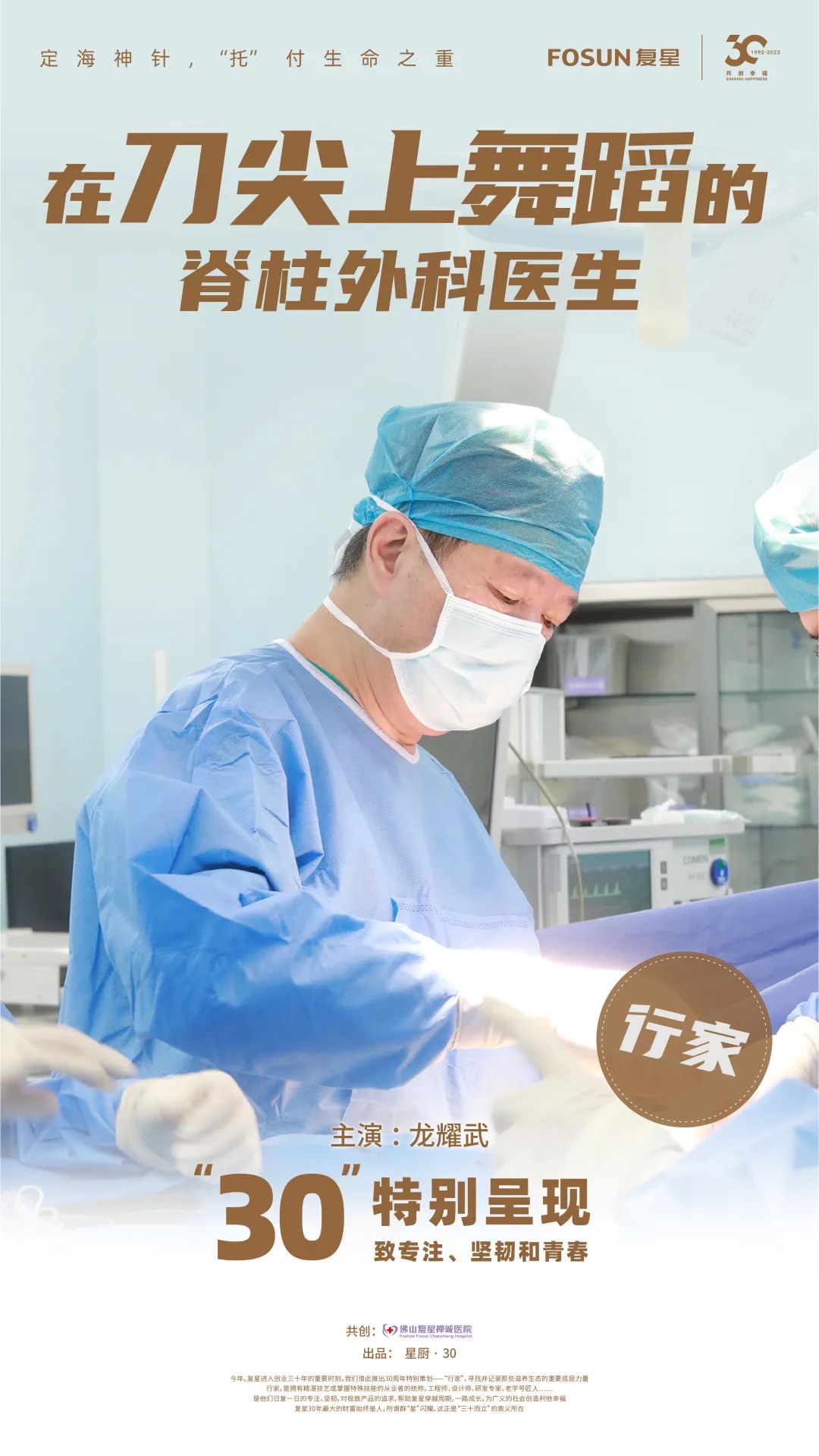 本期出场的《行家》是佛山复星禅诚医院(以下简称“佛山禅医”)的脊柱外科主任医师龙耀武。他是声名远扬的明星医生,也是科室的定海神针,从业30余年,治愈疑难杂症无数。脊柱外科医生又被称为“刀尖上的舞者”,以如“悬崖峭壁上行走”的手术难度,实现生命奇迹。佛山禅医是复星大健康板块的重要成员。而龙耀武的故事正是一则以专业、耐心和责任感造福人类健康的故事。