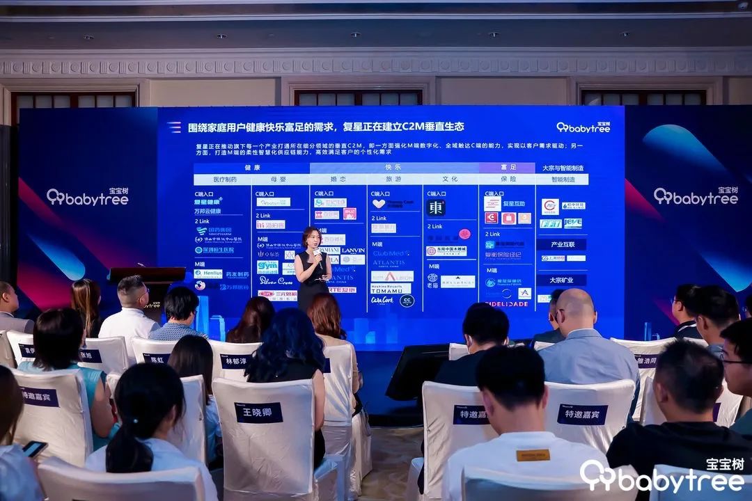 会议现场,宝宝树与复星旗下复星商社、健康、蜂巢等多产业负责人共同启动成立宝宝树X复星幸福生态联盟。