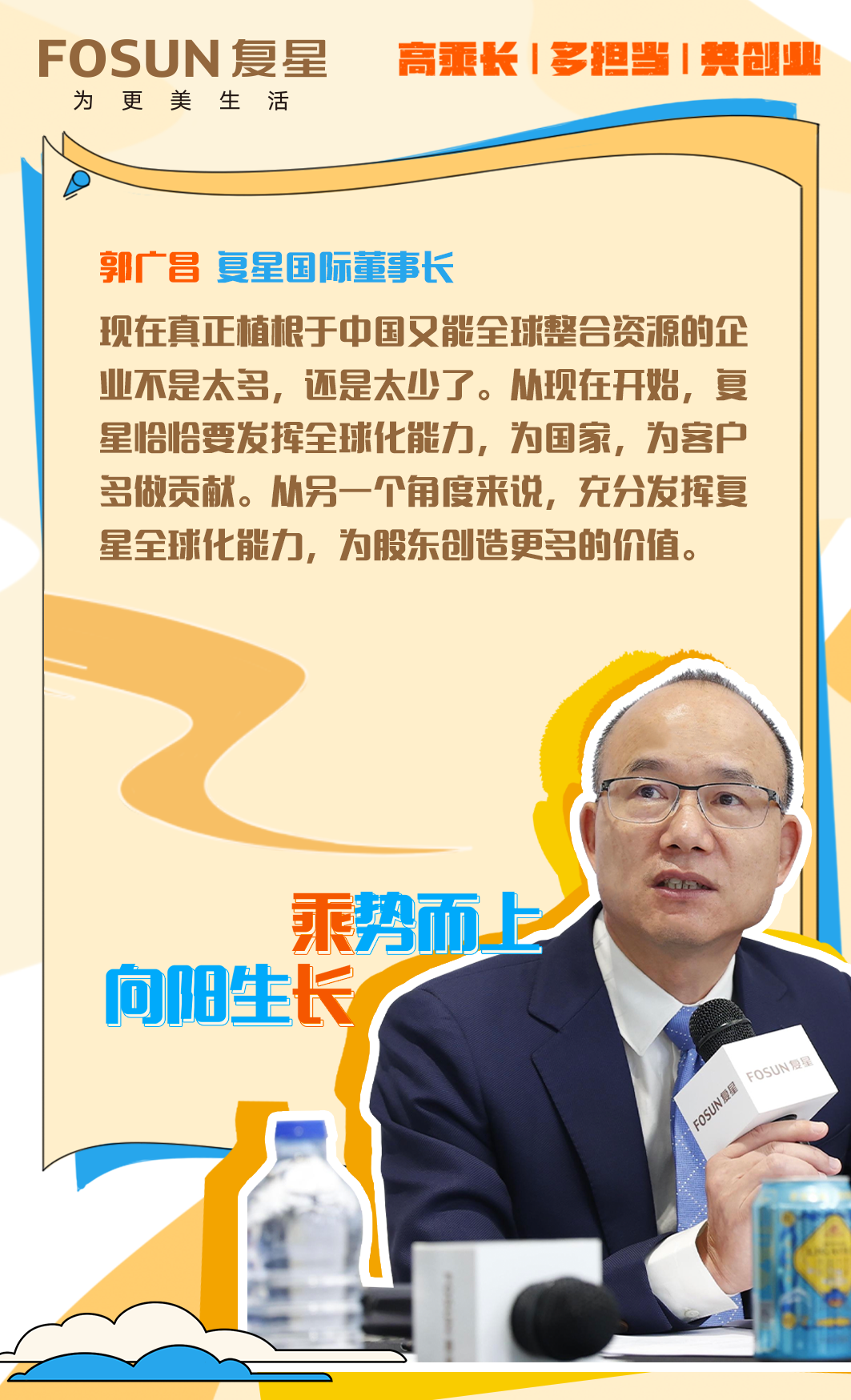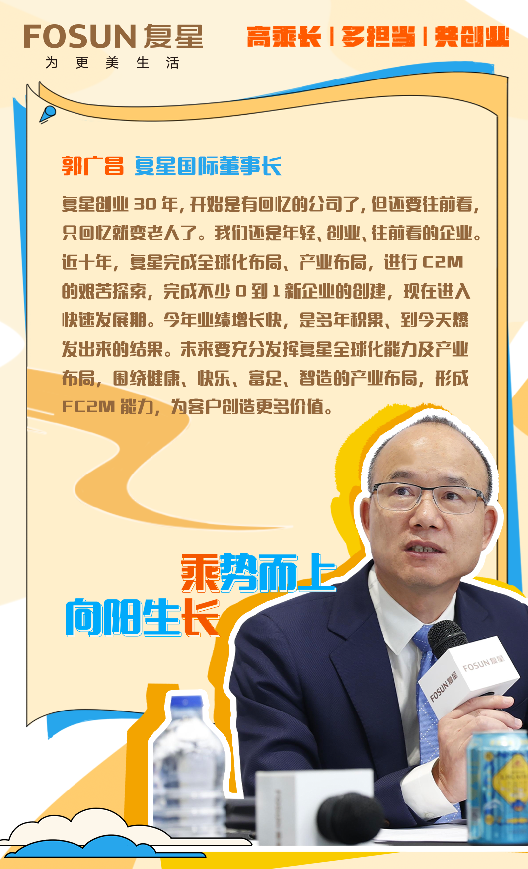 “真正植根于中国,但又能在全球整合资源的企业不是太多了,而是太少了。”郭广昌说,面对一些逆全球化的声音,复星恰恰要发挥全球化能力,围绕智造、健康、快乐、智造板块的产业布局,形成复星的FC2M能力,为国家、社会多做贡献,为客户创造更多价值。