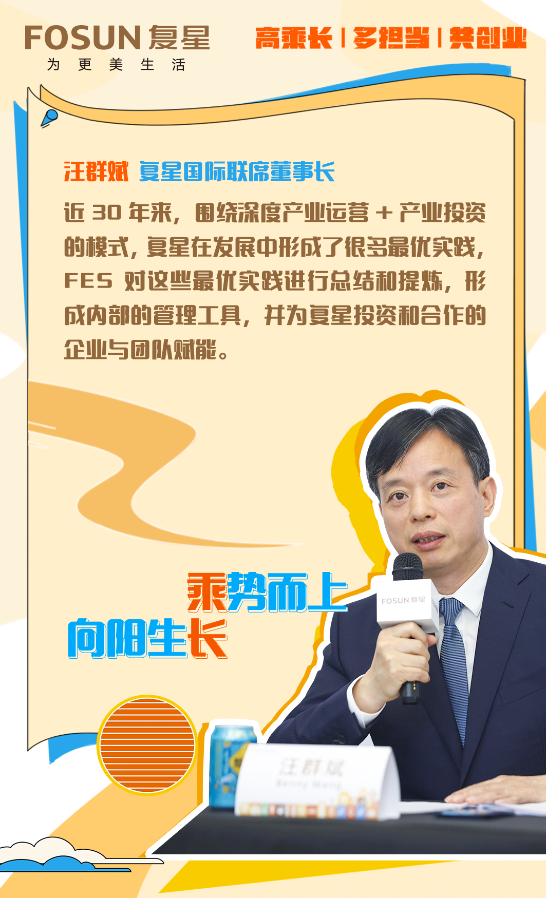 这次中期业绩发布中,复星首次提出“FES”(Fosun Entrepreneurship / Ecosystem System)的概念。复星国际联席董事长汪群斌介绍,复星在30年的发展中,围绕深度的产业运营+产业投资,形成了很多最优实践,FES是对此的总结提炼,作为复星的内部管理工具,为复星布局的产业和团队赋能,同时学习借鉴全球企业的经验,提升企业发展能力。