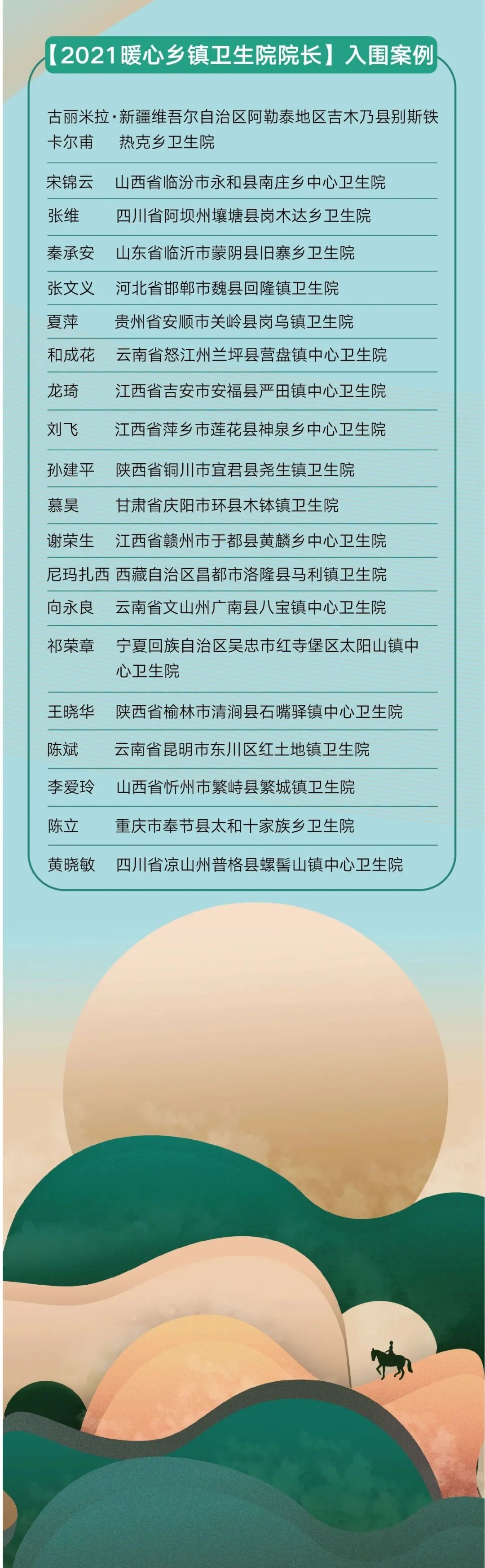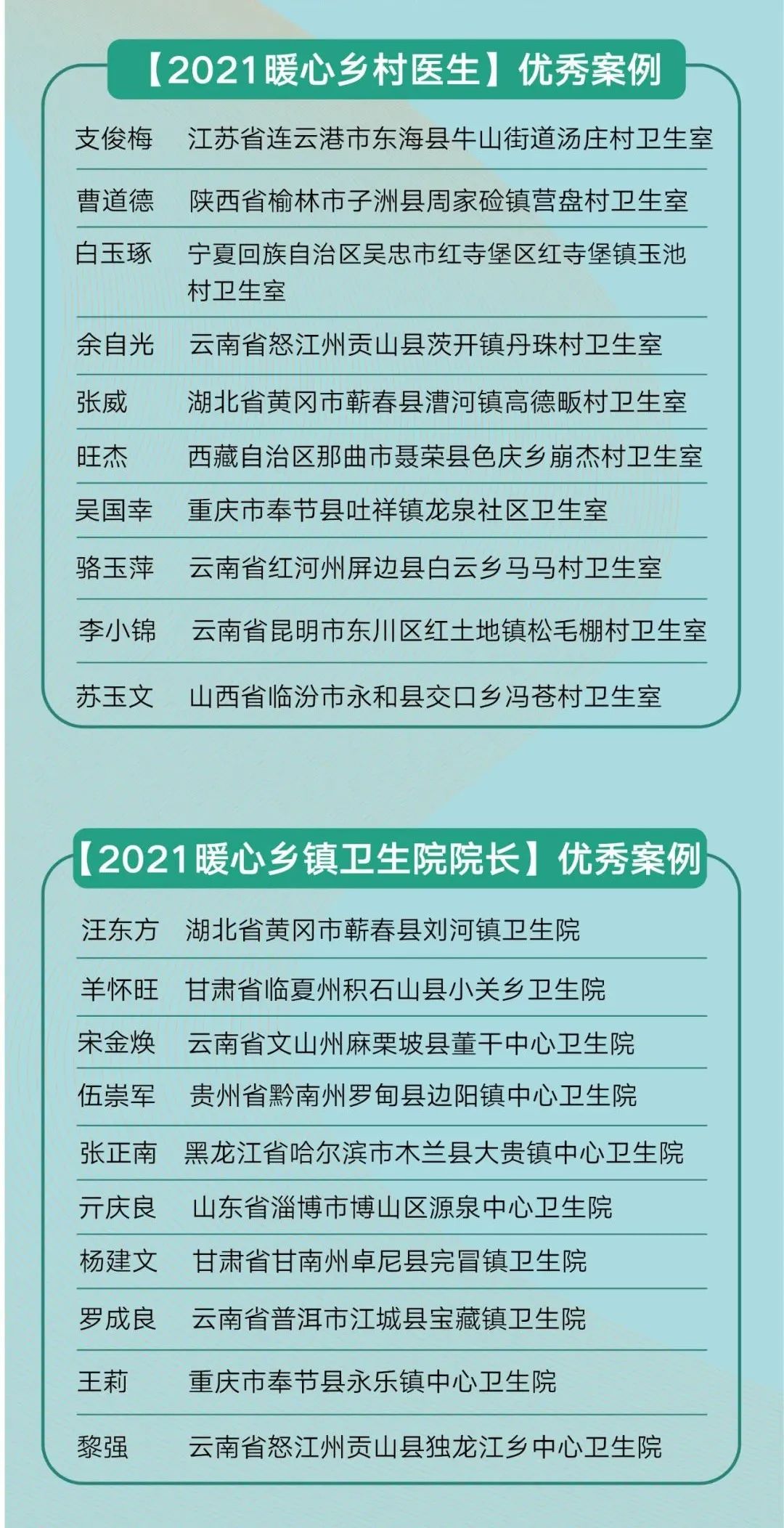 为寻找一批扎根基层、服务百姓,深受群众信任与喜爱的新时代基层卫生工作者,中国人口福利基金会、上海复星公益基金会等联合开展“2021暖心乡村医生及暖心乡镇卫生院院长”案例征集活动。