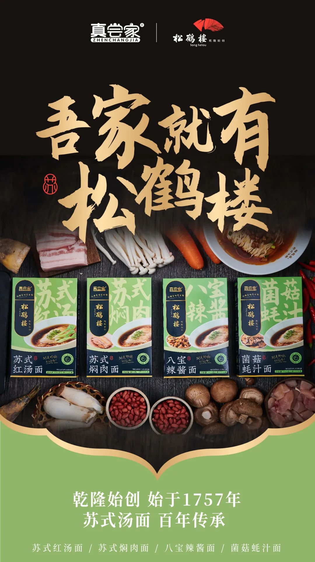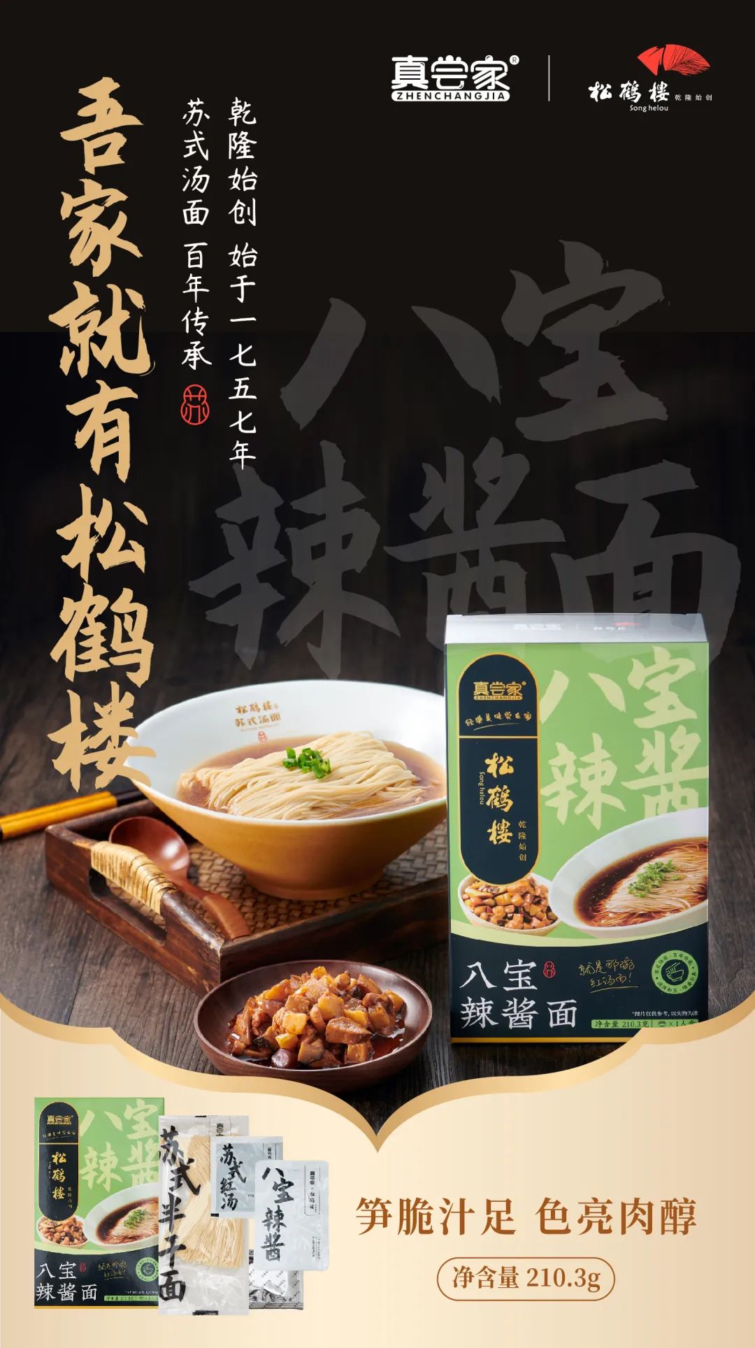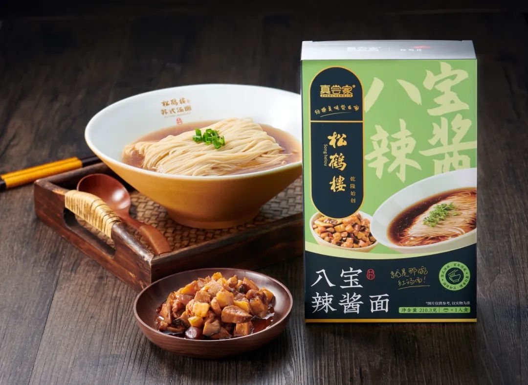 为了满足各个年龄段不同人群的需求,此次真尝家x松鹤楼共推出了4款面成为系列,分别是苏式红汤面、苏式焖肉面、八宝辣酱面、菌菇蚝汁面。
