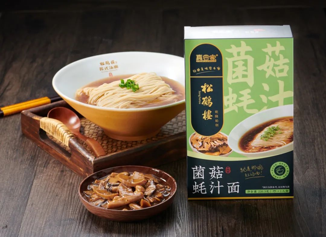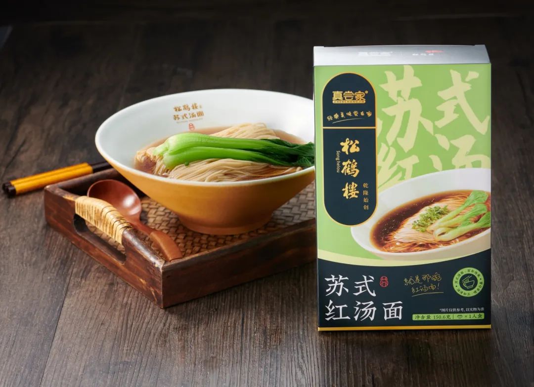 真尝家X松鹤楼推出的苏式红汤面,采用松鹤楼受人欢迎的四种口味,以招牌爆款为核心,开发冷冻与常温的预包装产品,不但是老字号品牌出圈创新,也是市场上全新的产品模式。