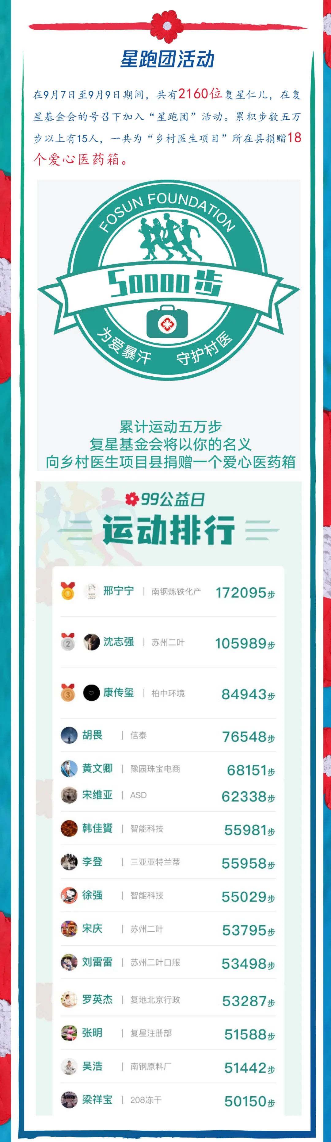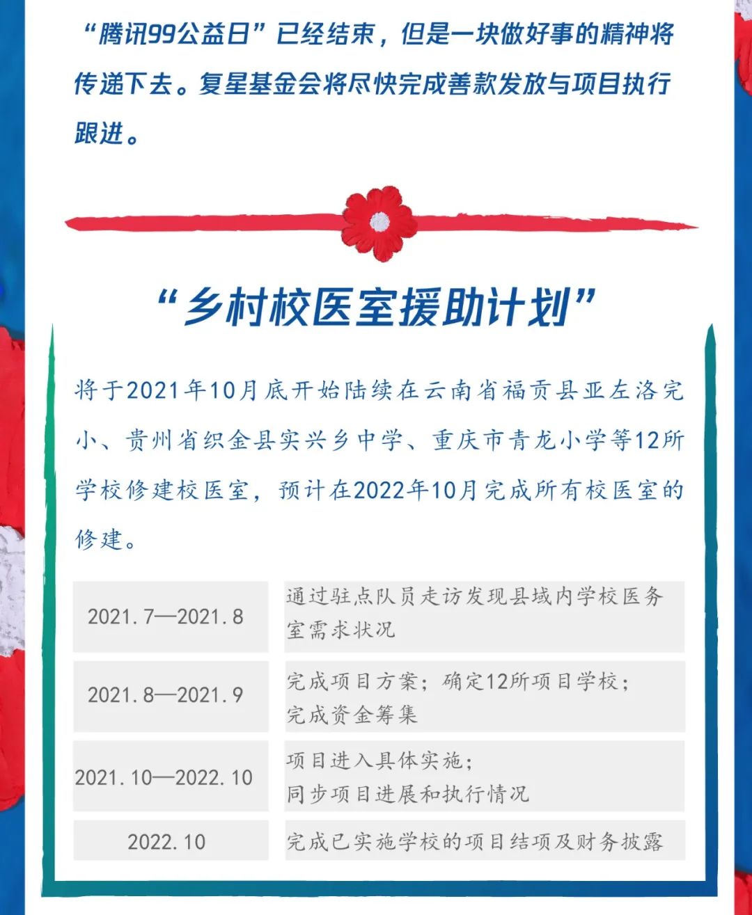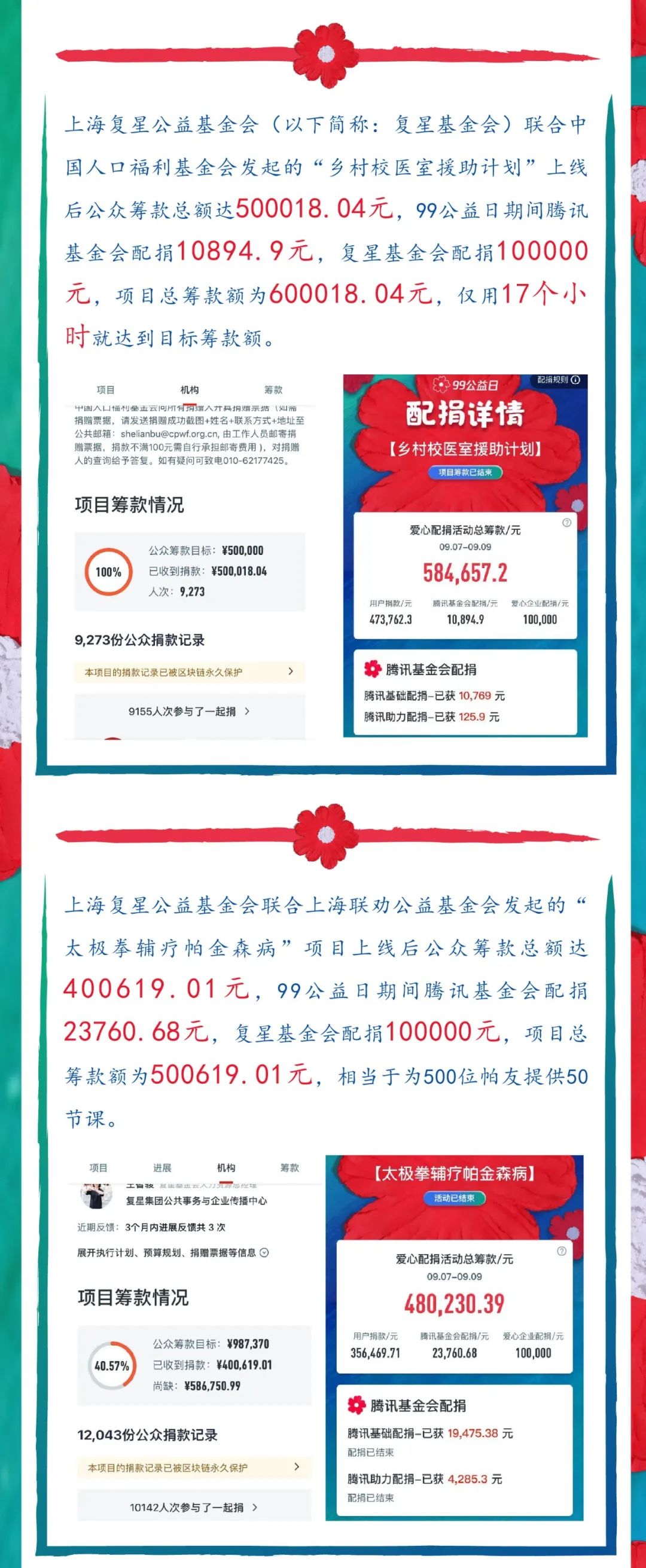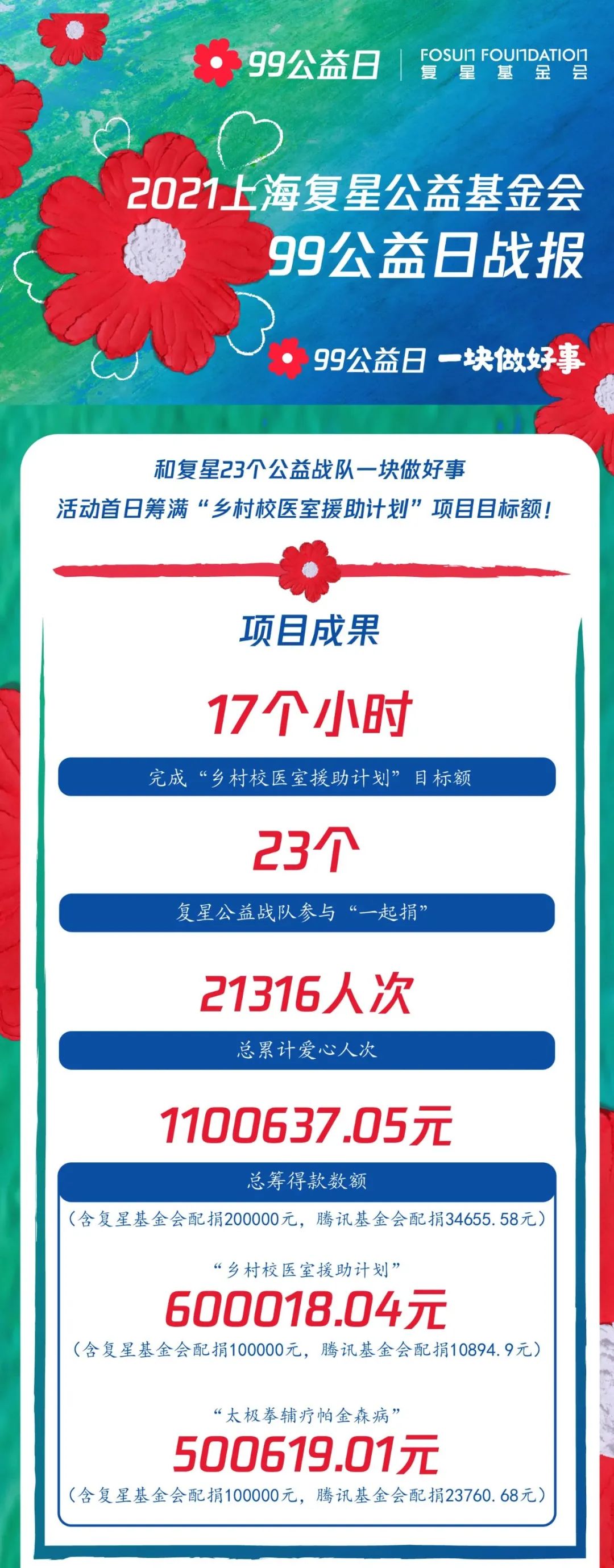 99公益日战报|23个复星公益战队为爱齐发力,“乡村校医室援助计划”项目筹款满额!
