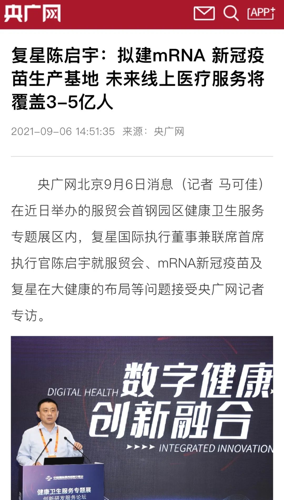 复星陈启宇:拟建mRNA新冠疫苗生产基地 未来线上医疗服务将覆盖3-5亿人