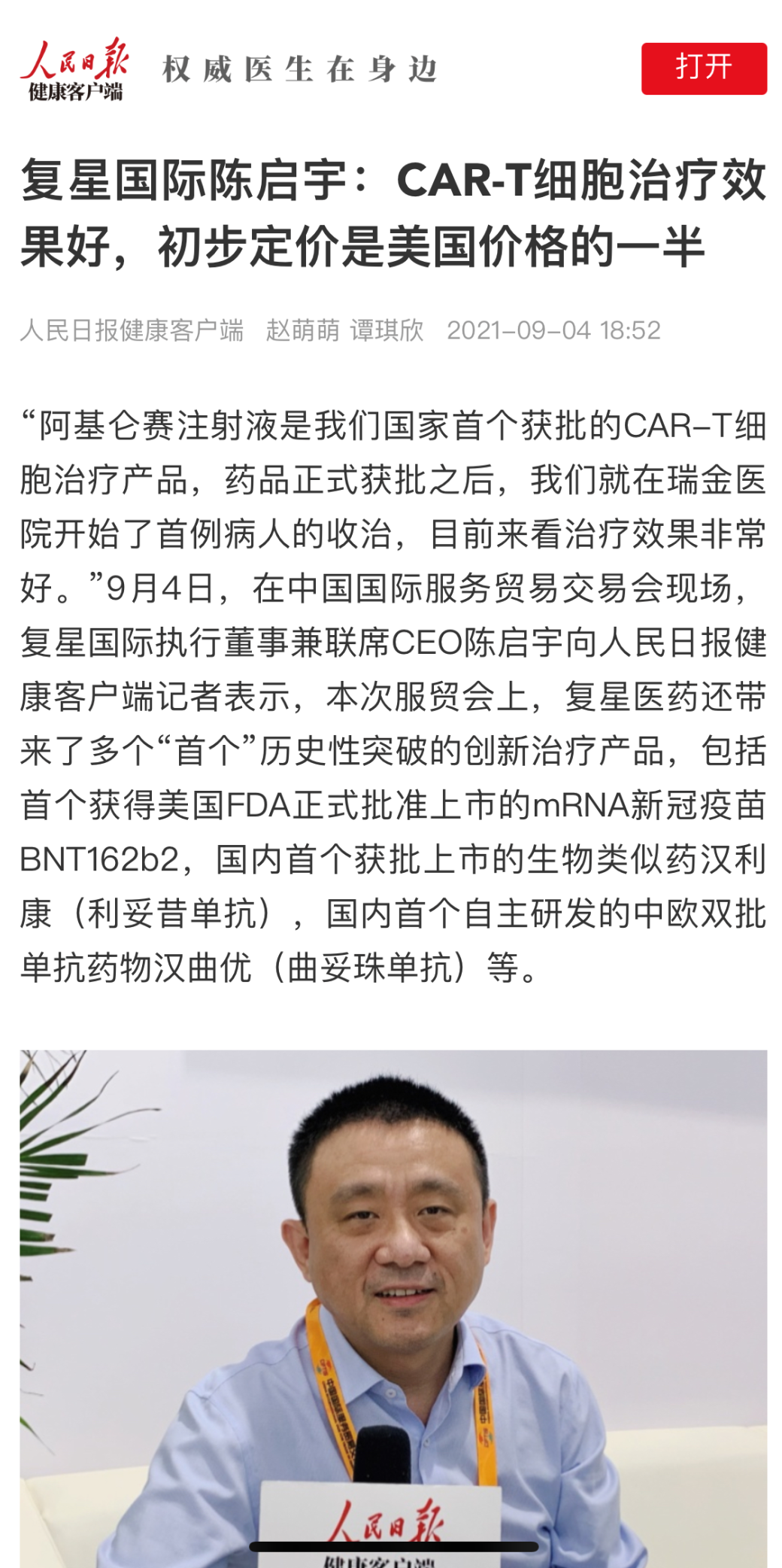 9月4日,复星国际执行董事兼联席CEO陈启宇来到复星健康展台,为多个创新医药健康产品点赞,并接受了央广网、人民日报、经济日报、北京日报、中新社等多家主流媒体采访。