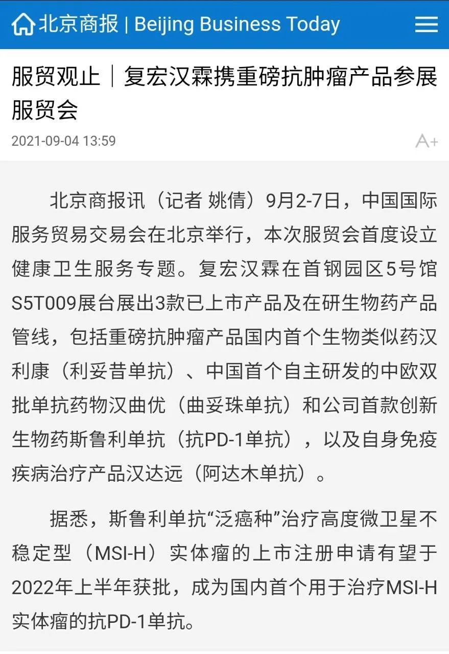 服贸观止 | 复宏汉霖携重磅抗肿瘤产品参展服贸会