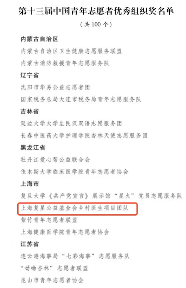 12月5日是“国际志愿者日”。共青团中央、中国青年志愿者协会发布第十三届中国青年志愿者优秀个人奖、组织奖、项目奖获得者名单,上海复星公益基金会(以下简称:复星基金会)乡村医生项目团队获得优秀组织奖。