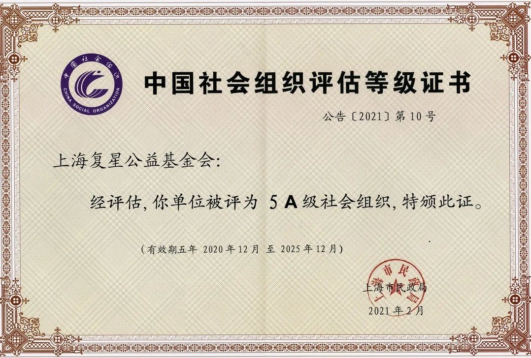 2021年4月13日,上海市民政局(上海市社会组织管理局)在上海公益新天地园举行上海市级社会组织评估等级授牌仪式,上海市民政局社会组织服务处处长赵宇向上海复星公益基金会颁发“5A”等级证书和牌匾。