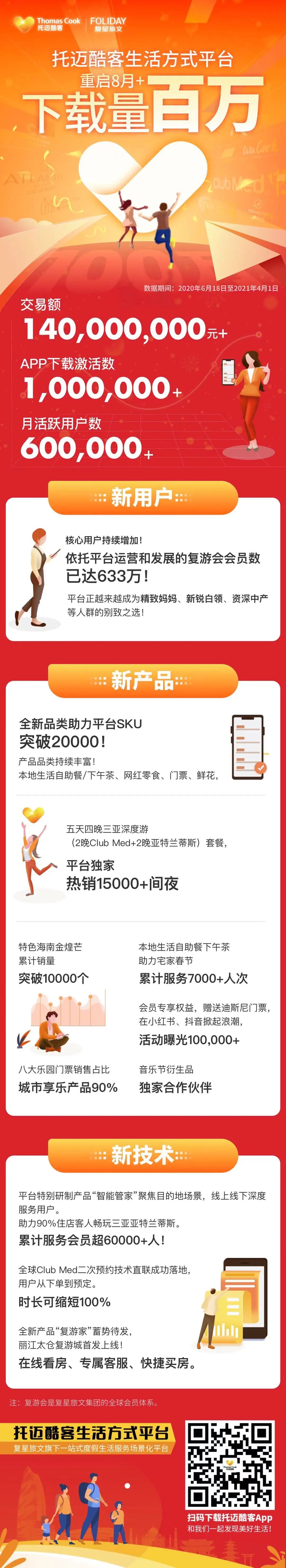 此外,复星旅文旗下一站式度假生活服务场景化平台——托迈酷客(ThomasCook)生活方式平台自2020年上线以来,发展势头迅猛。数据显示,2020年6月18日至2021年4月1日期间,平台交易额突破人民币1.4亿元,APP下载激活数突破100万,月活跃用户突破60万。其中,依托平台运营和发展的复游会会员已达633万,核心用户持续增加。