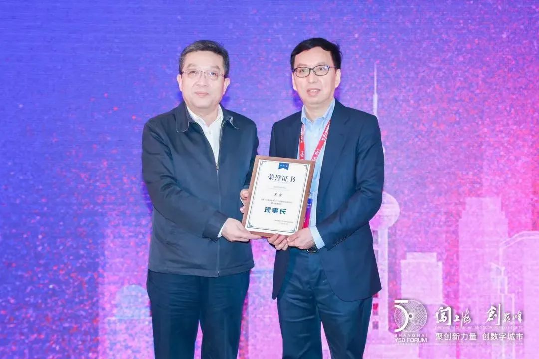 ▲论坛开幕式上,上海市委常委、统战部部长郑钢淼向“上海市青年五十人创新创业研究院”第一届理事长其实颁发证书