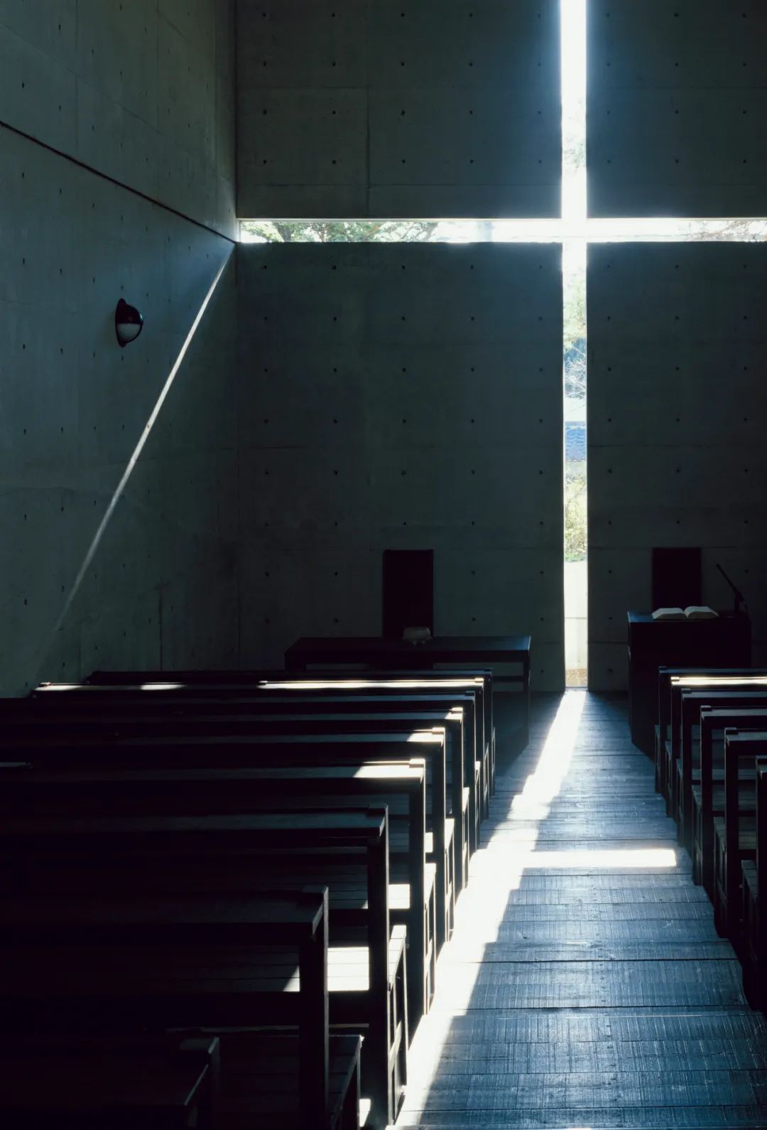 20岁时,安藤忠雄在大阪旧书店里“遇见”了勒·柯布西耶的作品集。他不经意翻阅,发现照片、草图、法文内容与书的版型有美感地呼应着。即便很喜欢,二手书的价格仍超过了他的开销范围。安藤忠雄怕书被其他人买走,偷偷把它藏在角落,每每经过书店都进去查看书还在不在,一个月后才将它抱回了家。起初安藤忠雄只是翻阅和临摹,看了更多柯布西耶的日文著作才真正认识这位自学出身的建筑家,如何与老旧体制对抗,开创自己的道路。“住吉的长屋”是安藤忠雄开启以建筑展开“对抗”的浓墨重彩的一笔。“住吉的长屋”外部除了入口,四面墙壁连一个窗户都没留,完全将都市生活排除在外,这样的设计和一般追求明亮的时尚家居潮流相反。内部已经很狭小的空间三等分,设置了露天中庭,各个房间的生活动线都被中庭切断了,如果下雨的话,去洗手间也要撑伞。面对种种生活上的不便,有人批评它是“建筑家的自我偏执”。而住在里面的人却欣然接受了这些不便,一住就是几十年。他们感受四季流转和光线的游移,有抱怨有兴奋,但从未感到厌烦。安藤忠雄从小跟着外婆在传统的长屋里长大。那里鳞次栉比的长条形木头房子连在一起,挡住了空气的流通和光线的射入,逼仄的格局只能用后院等小空间通风。他曾在谷崎润一郎的《阴翳礼赞》里面读到,理想中的日本居室,厕所应该远离堂屋。虽然这样很不方便,冬天还有感冒的风险,但正如斋藤绿雨所说“风流即清寒”,清冷的空气让浊气消散反而让人心情舒畅。现代人为了便利,舍去了个性,失去了与自然的连接。所以安藤忠雄在设计“住吉的长屋”时,用“浪费”的中庭找回和自然的联系,这是他以自己的方式,对生活与住家的意义做了思考和探究后的结论——顺应四季变化,享受到的生活乐趣是属于狭小土地的富足。建筑大师村野藤武曾内内外外看了“住吉的长屋”之后对安藤忠雄说:“姑且不论建筑的好坏,在这样狭窄的空间里经营生活令我感动。应该给住户搬个奖!”想来应该有很多展览的参观者都跟村野藤武有相同的观点。二楼展厅等比复原了“光之教堂”,并在里面展示了教堂的模型——一个箱形的主体结构。因为光之教堂位于茨木市的居民区,安藤忠雄为了营造出与城市杂乱区隔的缓冲空间,将造型如数字7的混凝土墙斜插进来。等比复原的“光之教堂”模拟了教众步入教堂时的感受,外界光线渐渐暗却,昏暗的空间里有序排列着一排排椅子,前方巨大的十字架形窗透进光来。法国朗香教堂也是一个“光空间”,相比之下,“光之教堂”的光线更幽深。位于茨木市居民区的光之教堂,上海复星艺术中心展览进行了1:1复制。(图片版权©安藤忠雄建筑研究所)安藤忠雄在本刊的邮件采访里表示:“我想创造出永存于人类记忆深处的建筑,而非仅仅是物质或形式的存在。为了接近自己内心的理想,我尝试创造去除一切修饰的、犹如素面画布一样的建筑。当那里被引入风和光这样的自然碎片后,所创造的空气,所注入的生命力,我期待着那是可以诉诸人类灵魂的力量。在这个层面上,以光为主题所做的宗教建筑工作,对我来说是以最纯粹的形式去面对‘永恒的建筑’的机会。”“光之教堂”筹建之时预算只有3500万日元,在当时泡沫经济的高峰期是捉襟见肘。安藤忠雄花了一年时间思考和设计,最后拿出了一个极简的方案:裸露的混凝土表面展现出苦行僧的质朴,长椅是用工地脚手架的杉木板做的。即便如此,预算还是只够盖墙体,安藤忠雄提议干脆舍去屋顶吧。他曾在巴塞罗那看过高迪没有完工的圣家堂,想着也做一件未完工的作品,结果有人赞助了屋顶费用,他的“私心”没能实现。一张著名的安藤忠雄肖像就拍摄于“光之教堂”,透过十字架形窗摄入的一道光线打在他的眉眼之间,除此之外都陷于阴影当中,显得眼神格外坚定。安藤忠雄曾说过,“真正的幸福不是待在光明之中。从远处凝望光明,朝它奋力奔去,就在那拼命忘我的时间里,才有人生真正的充实。”