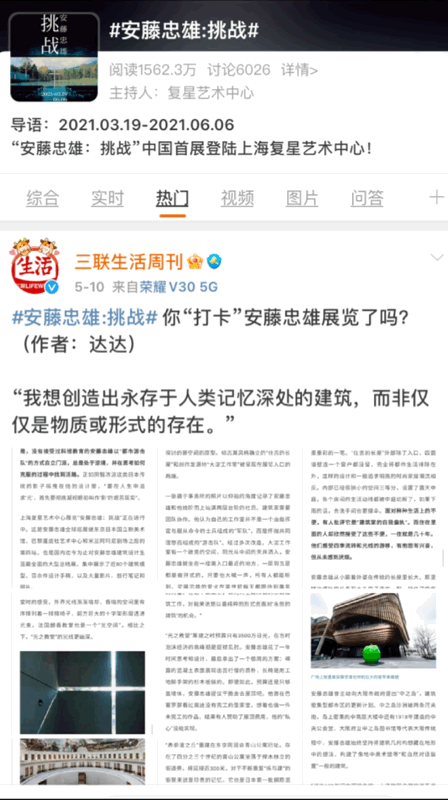 自3月开展以来,该展即引发全民观展热潮,成为小红书热门打卡点,微博、抖音等各大平台上的话题讨论指数居高不下,明星、潮人纷纷打卡,观展人次共计逾15万……此次安藤与复星艺术中心合作的巨大成功,标志着复星蜂巢海外IP返程赋能战略的更多可能性。