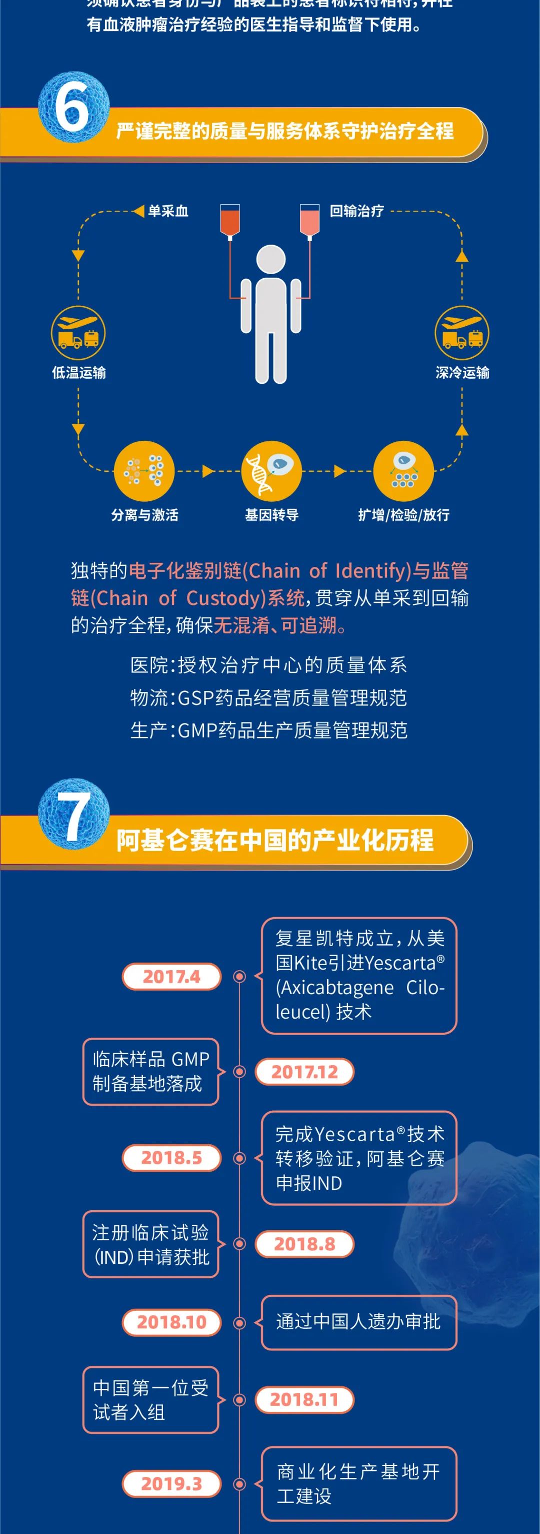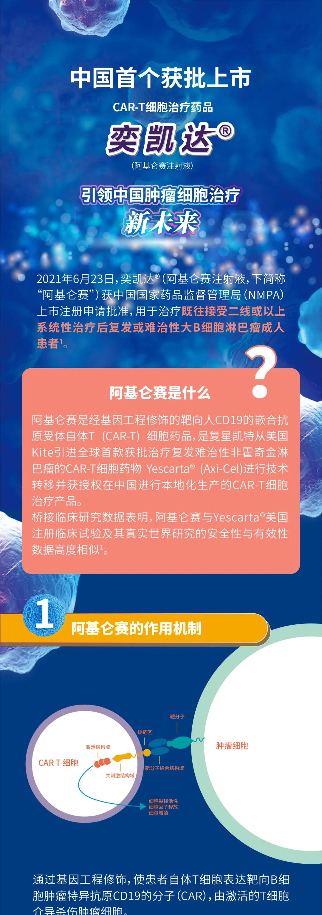 奕凯达®(阿基仑赛注射液)是复星凯特引进美国Kite(吉利德科学旗下公司,以下简称“Kite”)全球首个获批治疗非霍奇金淋巴瘤的CAR-T产品Yescarta®(Axi-Cel)进行技术转移并获授权在中国进行本地化生产的靶向人CD19自体CAR-T细胞治疗产品。此项获批是基于复星凯特在中国开展的一项单臂、开放性、多中心桥接临床试验结果,在难治性侵袭性弥漫大B细胞淋巴瘤中国患者中验证了其有效性和安全性。