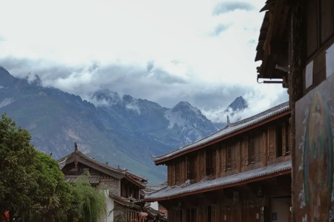 清晨,玉龙雪山顶峰在云层中微微露出一角,很快又被云团遮住。当下正是雨季,在连续多天降雨之后,各种菌子在森林里野蛮生长。