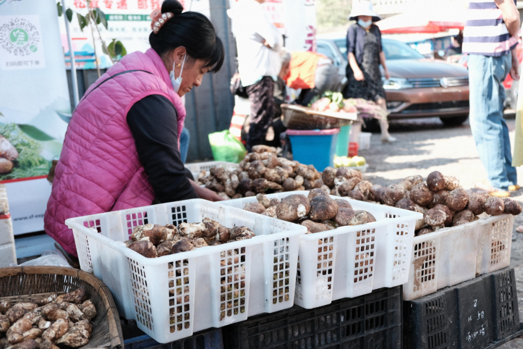 从古城南门往西走,有一条忠义巷,巷口牌楼上写着:古城忠义市场。往里走摆满了各种小摊,有固定摊位的,有推三轮车的,也有人就在地上简单铺一张塑料布,出售带着泥土和露水的新鲜蔬菜。老奶奶用竹篮盛着满满的野生菌,跟过往行人招呼:“菌子看一看噶”。
