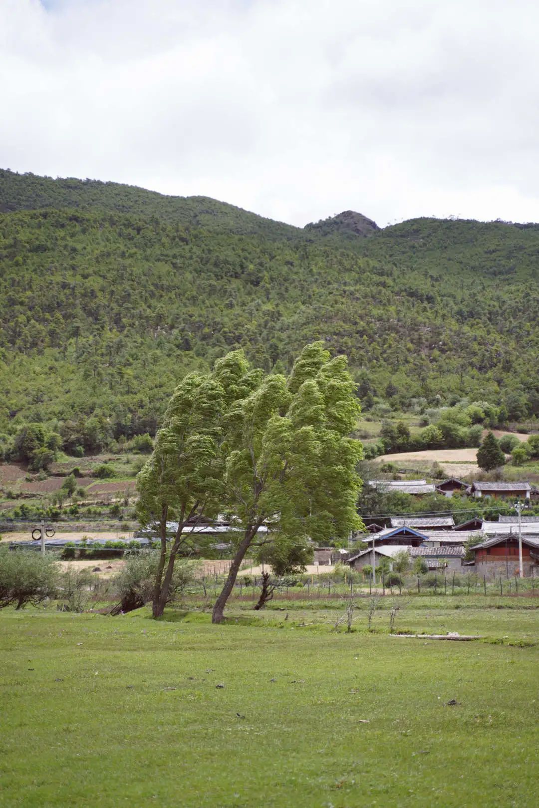 从松林里出来,沿着山路驾车往前走,拐过几个弯之后,出现一个坝子,坝子里有淡蓝色湖泊、明翠的草地和山峦。稍远处,一片传统纳西村落安静地躺在白云下。这一幕让人想到《消失的地平线》里,康维发现的蓝月山谷。