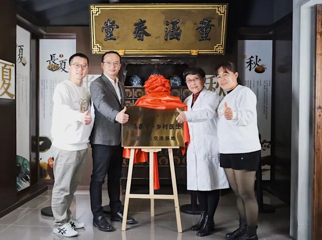 ▴ 村医骆玉萍(右一)与童涵春堂联席总经理叶嘉欣(左二)、上海复星公益基金会项目总监郭帅(左一)、中医郄玉兰(右二)共同为“中医文化交流基地”揭牌