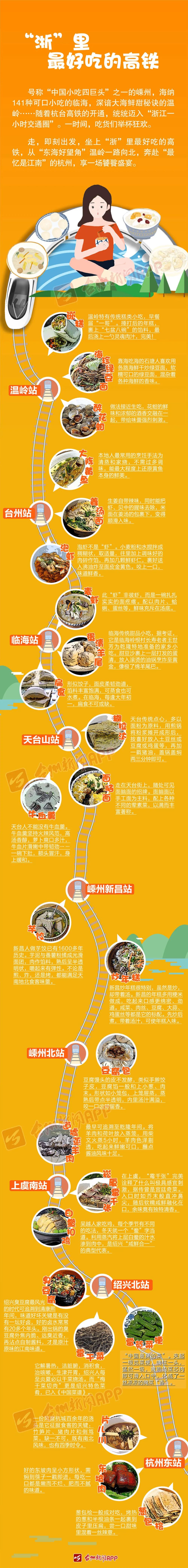 除了眼前迷人的江南风景,这还是“浙江省内最好吃的高铁”,舌尖的江南魅力保证让你沉醉“百味”,流连忘返。在嵊州,能吃到“花样百出”的小吃中的三巨头:小笼包、年糕、榨面;在新昌,尝尝“中华名特品种”花生——小京生,尝尝“百年美味”镜岭番酥烧,尝尝糯唧唧的芋饺;在上虞,尝尝鲜舌头的“上虞四鲜”;在越城,一口臭豆腐体验古城风味;在柯桥,安昌腊肠油香入魂……杭绍台铁路,可以说完完全全“长在”吃货的胃上了,挑个周末,坐上这条“浙江省内最好吃高铁”,保证撑到扶墙走。