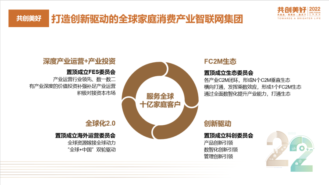 回顾2021年,我们有很多的创新与亮点,但也有一些待解决的痛点。2021年,我们持续提升品牌形象,扩大C端客户规模并提升用户满意度;我们在M端也不断推出重磅产品,带动整体收入增长;国内外投资深度布局,国内外双轮驱动;深化组织能力建设,四大委员会成立置顶;智能科技升级,产业互联成果凸显。2021年的核心痛点主要包括C端置顶有待提升;行业数一数二M端产品及企业数量太少;CXO阵型配置以及合伙人运营体系建设不足;价值高乘长不足;运营流程进化仍不够快;生态乘数效应发挥不足;风控体系仍需持续提升。2022年,我们在保持并扩大去年亮点的同时,也要积极面对暴露出的核心痛点,逐步改善,实现企业的价值高乘长。