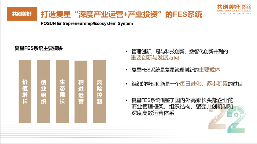 在FES管理赋能方面,我们设立FES委员会推动FES全面落地,并通过FES工具箱、专家库和案例库赋能复星各个生态企业,推动整个集团的价值乘长。