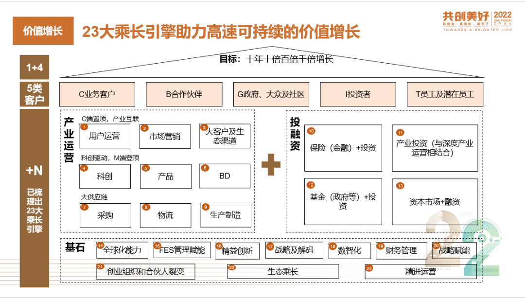 针对十年十倍百倍千倍价值增长目标,我们制定了四项指标,围绕企业五类客户梳理出了23大乘长引擎助力高速可持续的价值增长,其中产业运营方面有9大引擎,投融资方面有4大引擎,基石能力方面有10大引擎,未来还会继续更新调整。