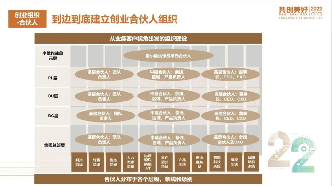 复星的价值高乘长最终还是要靠每一个复星的合伙人,因此,我们要继续加强到边到底的合伙人组织建设,并且充分打造合伙人的裂变机制。我们不仅要对合伙人有激励,对于引进和培养合伙人的合伙人也要有激励,通过至少三层的激励裂变,吸引全球更多的高潜人才加入复星,共同创业。在组织方面,我们也要坚持“三生万物,多团队竞合”的基本规则,重要的事情有三个及以上专职的人、专职的团队来负责,打造问题价值导向的战役机制,鼓励跨层级沟通,让企业充满不同的声音。同时,进一步完善蓝军机制,驱动组织进化与创新。