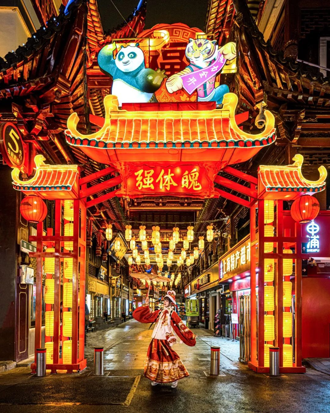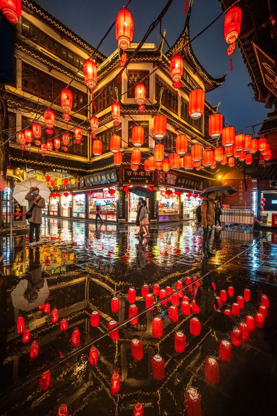 黄金广场自然是豫园的黄金宝地。此地有金碧辉煌的老庙黄金旗舰店坐镇,招财树下,财神爷一手捧元宝、一手比“耶”,组合成谐趣的“财神‘耶’”灯组,成为了许多市民的必打卡之处。