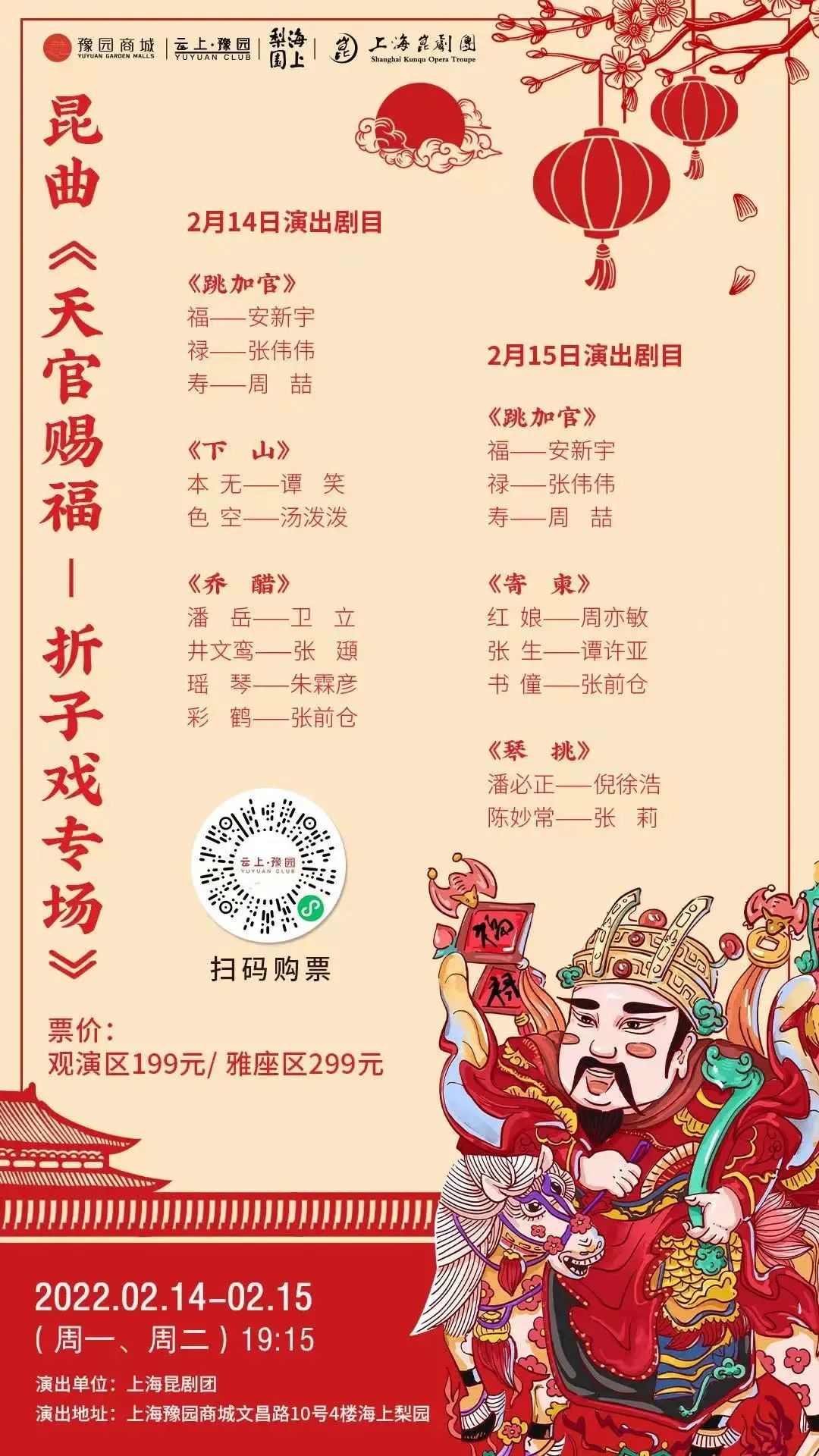 与华宝楼对应的海上梨园,是俯瞰豫园的高空戏台,于2月14日、2月15日接连上演昆曲《天官赐福-折子戏专场》。其中《跳加官》是戏曲重大演出的开场仪式。彩蛋环节,上海昆剧团的演员将广撒“金币”,祝戏迷朋友财源大开。