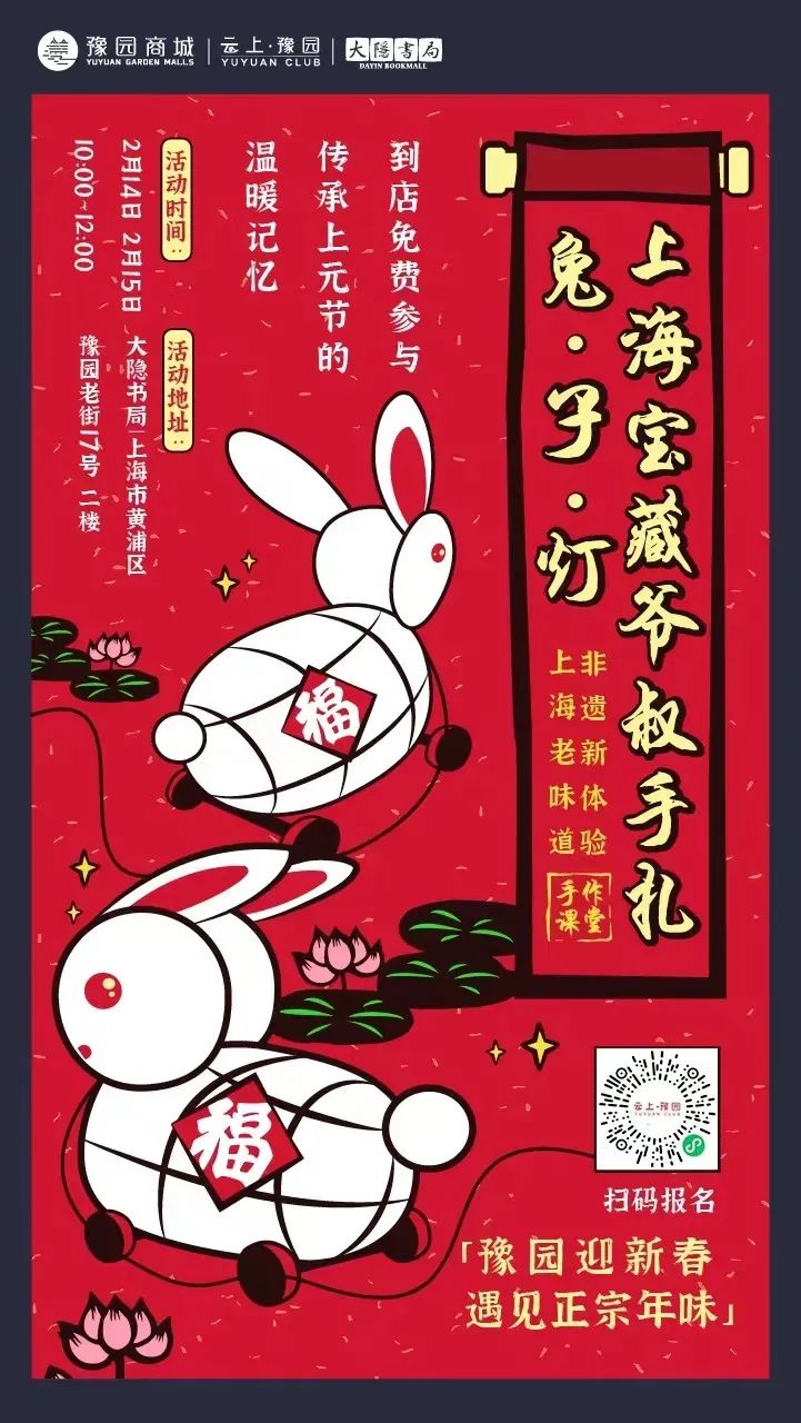 手扎兔子灯也是上海人白相城隍庙的共同回忆。拖着可爱的兔子灯走街串巷,小朋友简直不要太拉风。2月14日和2月15日,66岁的上海爷叔李建国将亲授大家扎一盏传统兔子灯。他被称作宝藏爷叔,一年350天都在手扎灯彩,就是为了让元宵温暖的记忆能够代代传承,真真应了那句“家人闲坐,灯火可亲”。