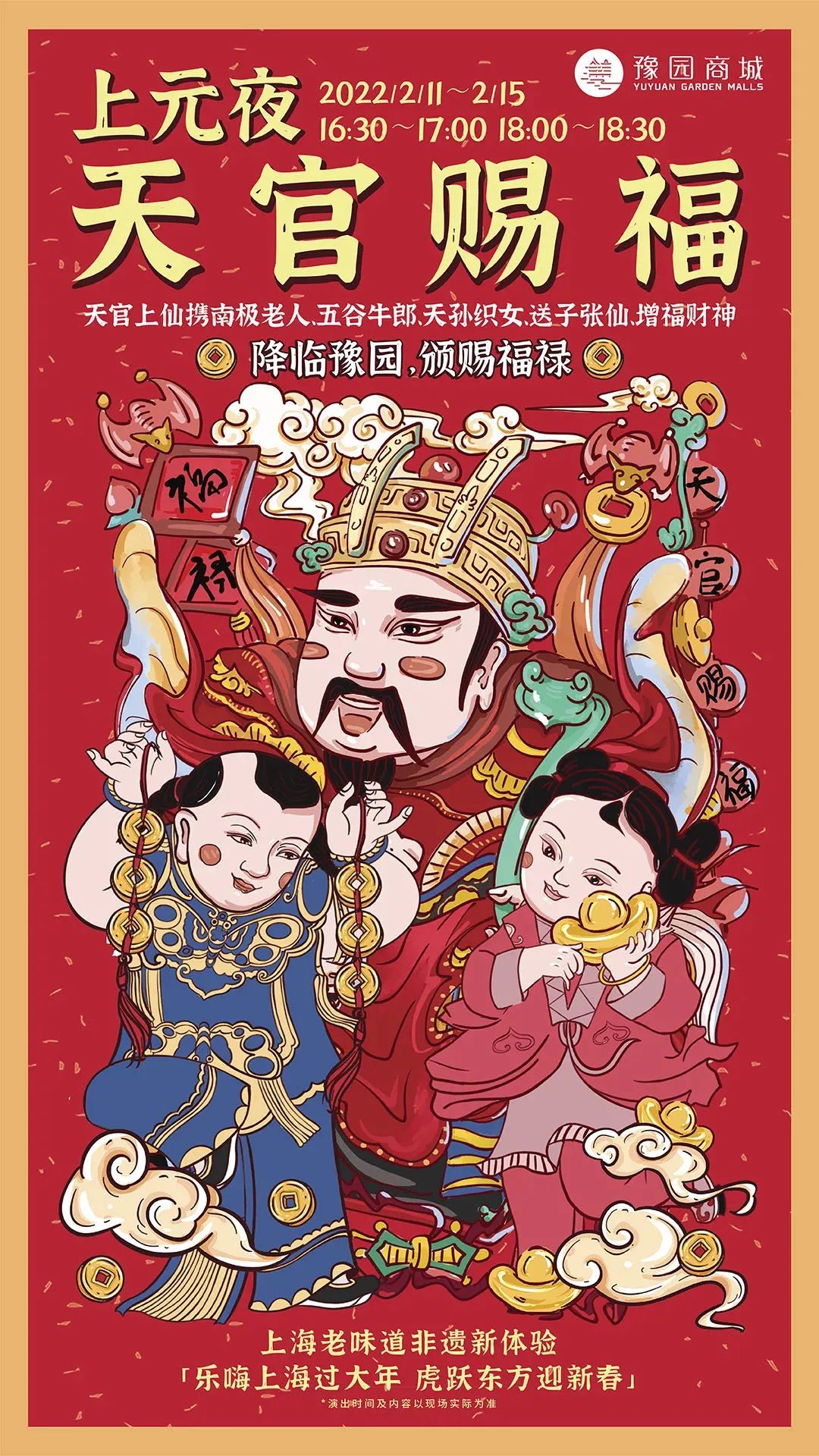 2月11日至2月15日游豫园,可能会偶遇这么一群“上仙”。身着绣龙红袍的是“天官大帝”;自带长髯的是“送子张仙”;还有成双成对的“牛郎织女”,手拄葫芦拐杖的“南极仙翁”以及浓墨重彩的“赠福财神”。