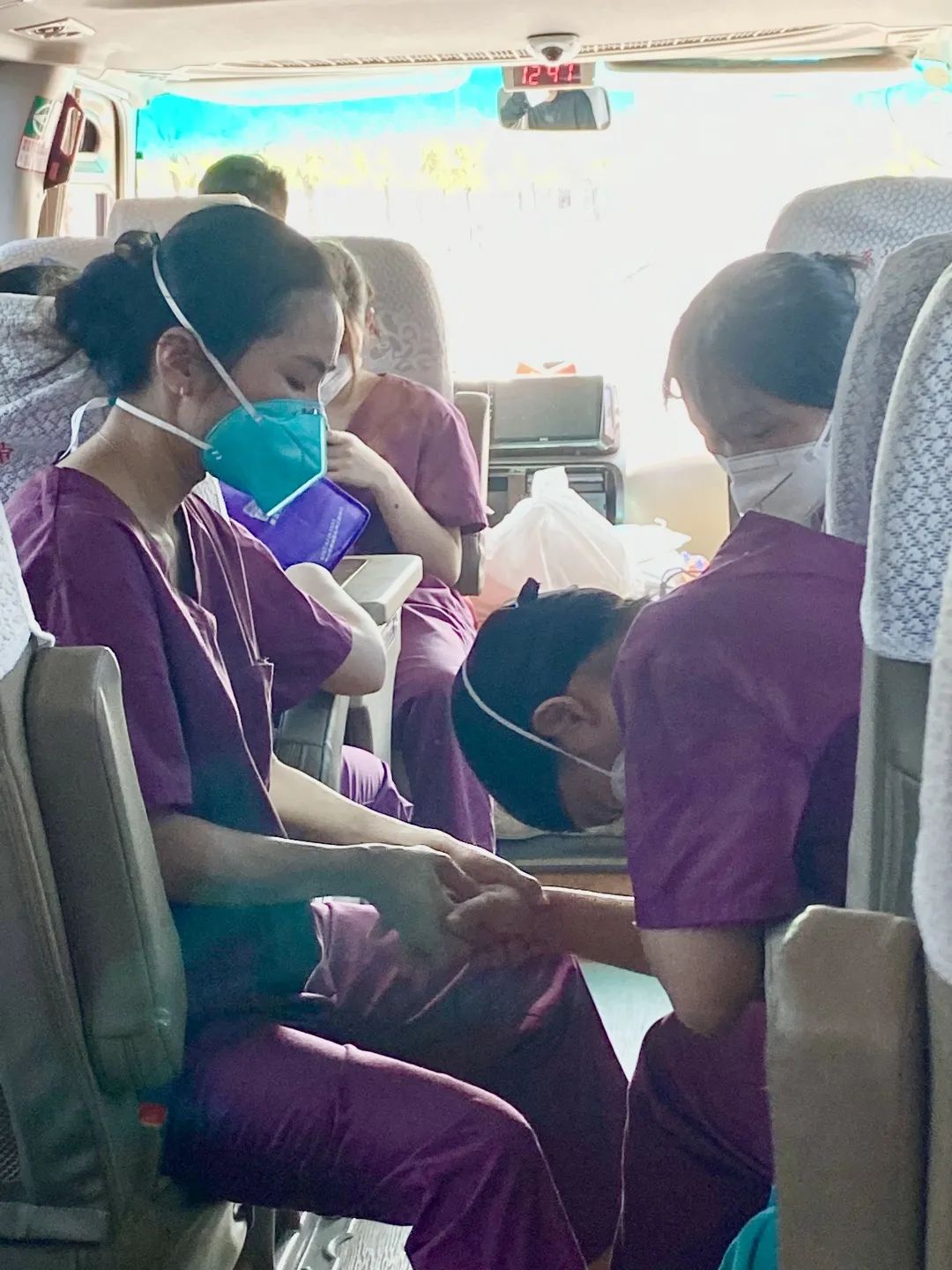 平时都经常晕车的佛山复星禅诚医院护士邹丽珍,经过一天7-8次的核酸点转场头晕难忍,结束一天采样返程的车上,同事细心地给她做合谷穴按压缓解头晕,她说,再难受也阻挡不了守沪决心。