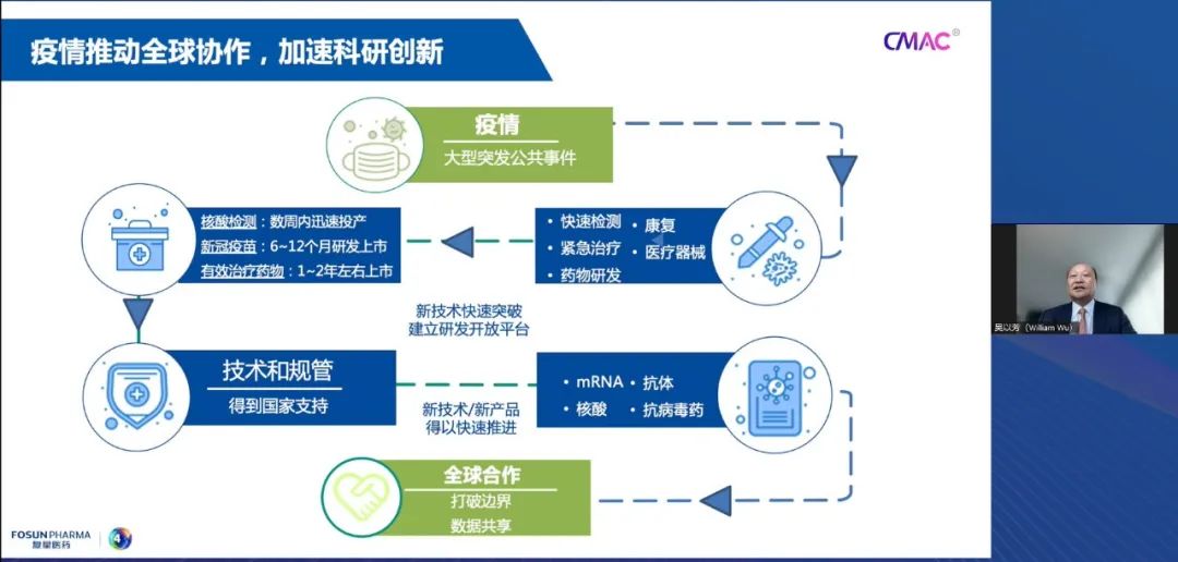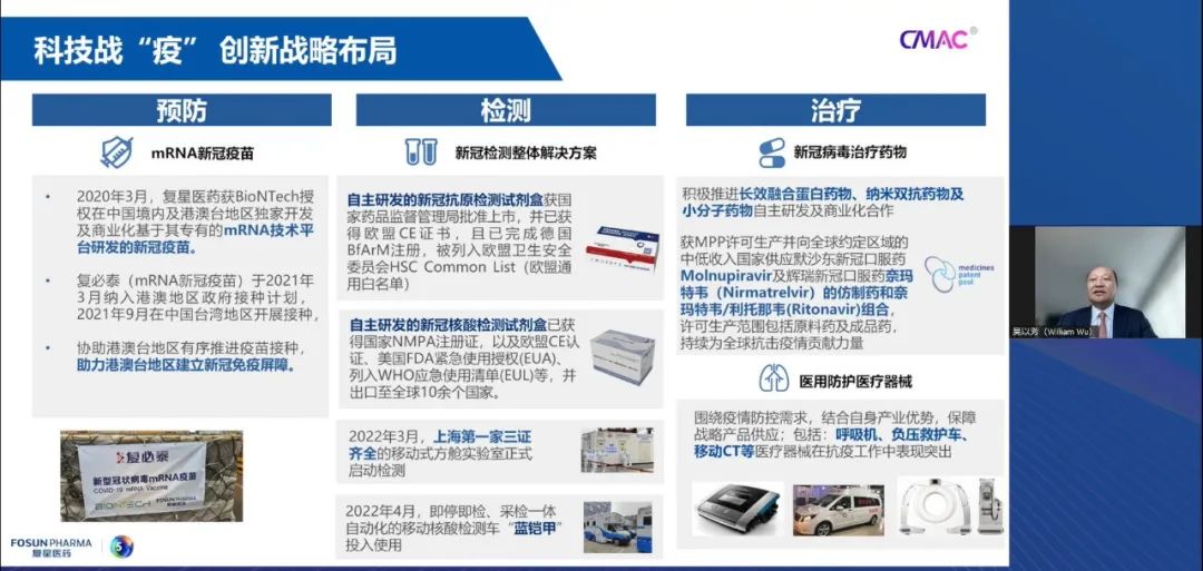 2022年7月7日,2022中国创新药物(械)医学大会暨第七届CMAC年会在杭州开幕, 本届CMAC年会汇聚了多位来自政府、科研机构及国内外领先医药企业代表出席,通过主题演讲、论坛等形式分享全球医疗健康行业的前沿发展趋势,探讨如何通过创新及国际化推动行业实现高质量发展。复星医药董事长吴以芳作为专题论坛《mRNA技术未来前景》的演讲嘉宾之一,带来了题为《复星医药应对新冠创新战略布局与mRNA疫苗商业化进展》的主旨演讲,分享了在新冠疫情背景下复星医药如何凭借多年来积累的科技创新能力和全球化经验助力全球疫情防控。