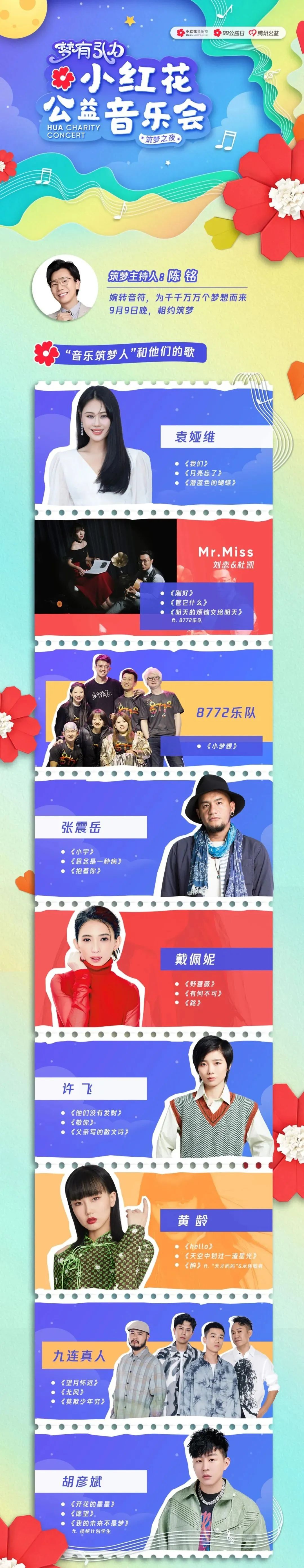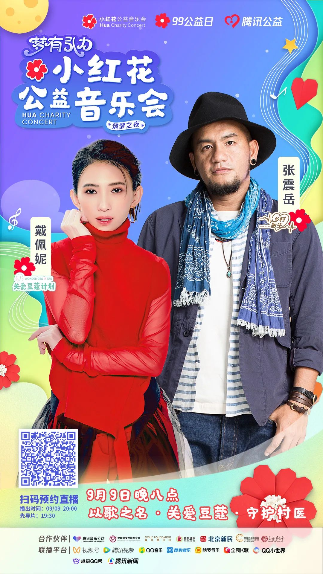 9月9日19:30,腾讯公益发起“梦有引力”小红花公益音乐会,邀请张震岳、胡彦斌、戴佩妮、袁娅维、Mr. Miss(刘恋、杜凯)、黄龄、许飞、九连真人、8772乐队组成“音乐筑梦团”,与多家公益组织的受助人一同在北京八达岭长城脚下、深圳梦想音乐空间和贵州三都水族自治县,为千万个美好质朴的公益梦想歌唱。