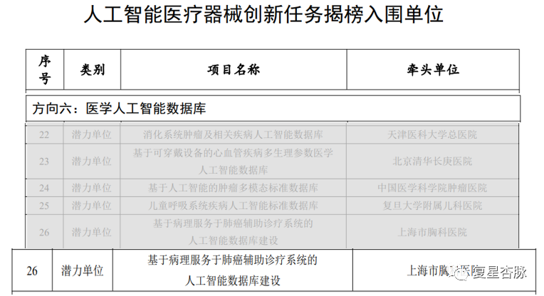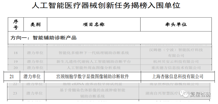 近日,工业和信息化部和国家药品监督管理局公示了人工智能医疗器械创新任务揭榜入围单位名单。复星杏脉分别在:智能辅助诊断产品、医学人工智能数据库等多方向,获得上榜。也是复星杏脉在构建跨学科领域交叉数据分析应用多领域、多场景的体现。