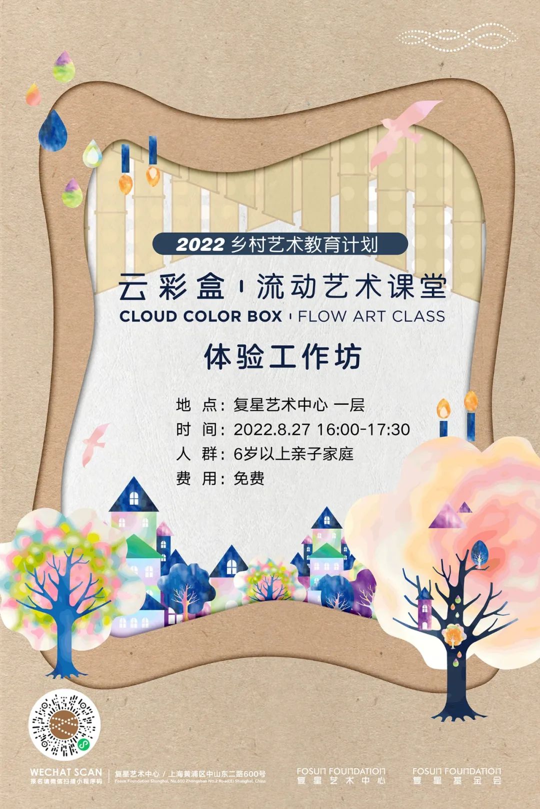 本次“云彩盒”体验工作坊,由上海复星艺术中心主办。特别邀请城市里的亲子家庭至现场参与课程包DIY工作坊,搭建记录你童年美好的剧场盒子!