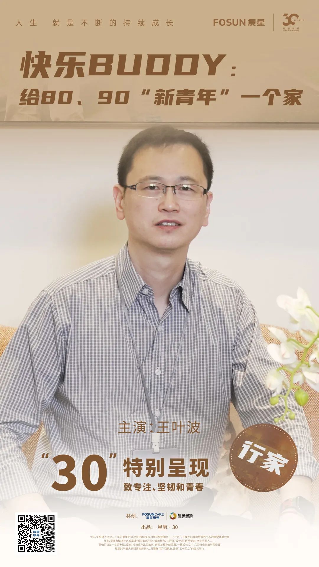 本期《行家》是一位和80、90后“新青年”打成一片的70后。王叶波,47岁,是复星康养旗下复星星堡中环社区的一位院长,负责照拂长者的幸福晚年。他陪聊天、陪画画、陪喝咖啡、时不时扮演圣诞老人逗趣……以437项标准的服务流程,也以发自内心的体贴与关爱,为一群80、90“新青年”构筑快乐享老的“家”。复星星堡是复星健康蜂巢的标杆性项目,为中国城市人口老龄化问题探索解决方案。而王叶波的故事,也为银发族应当如何享老打开了新的窗口。