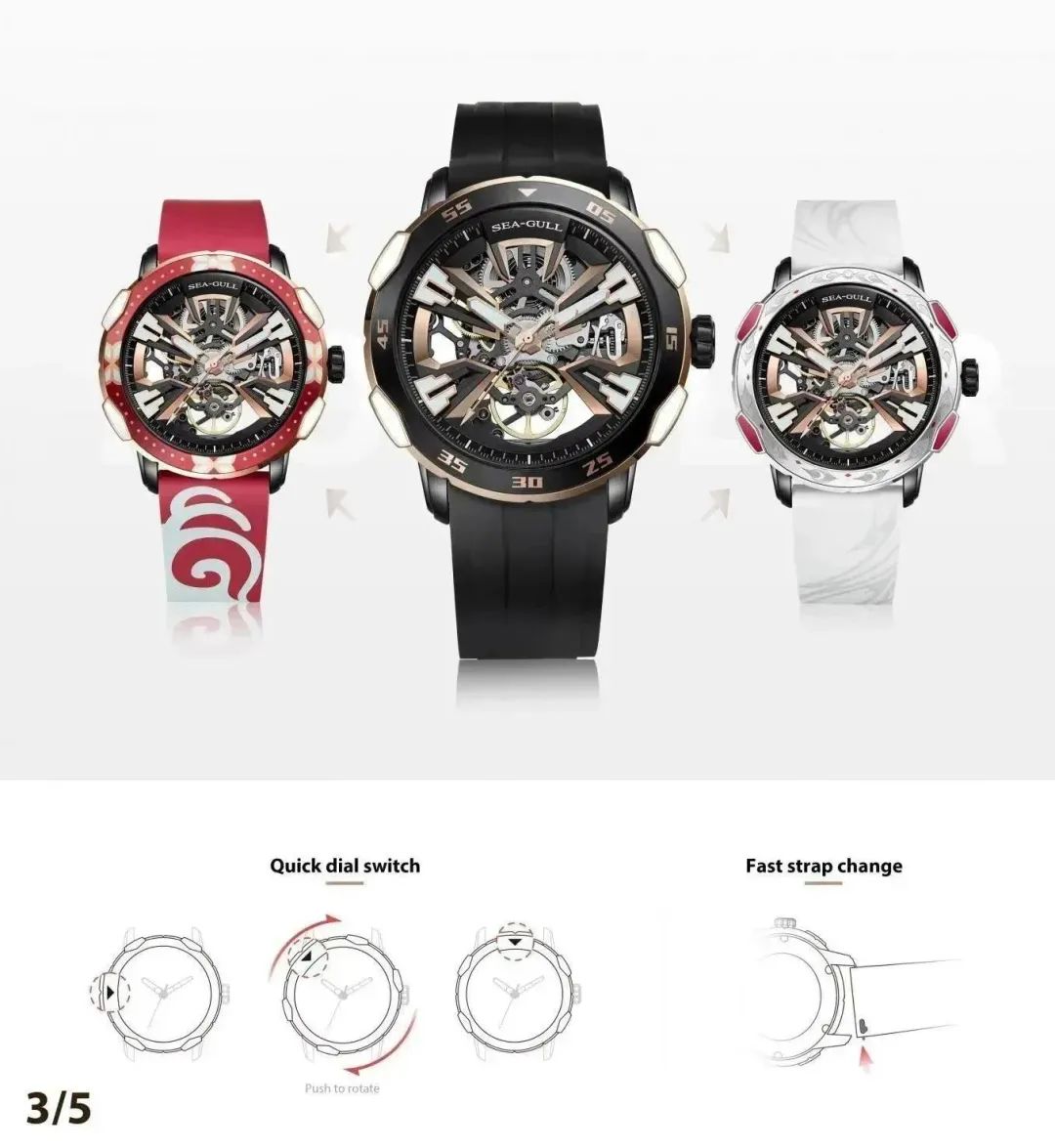 边界系列就是海鸥表在2022年做的一次重大突破和创新,这也是源自于杜毅锋一个大胆的想法:年轻人可以按照自己的风格改装车、改装模型,腕表的配件也可以有更多新玩法。边界系列以其革新性的专有结构设计,实现“快旋换肤,快拆换带”一表多戴的功能特性,获得2022MUSE国际设计奖金奖。同时和王者荣耀这款年轻用户众多的经典手游联名合作,配备不同款式的表圈表带,开辟以腕表为中心可以交换配件的新社交方式,带来更多“突破边界”创新发展的可能。
