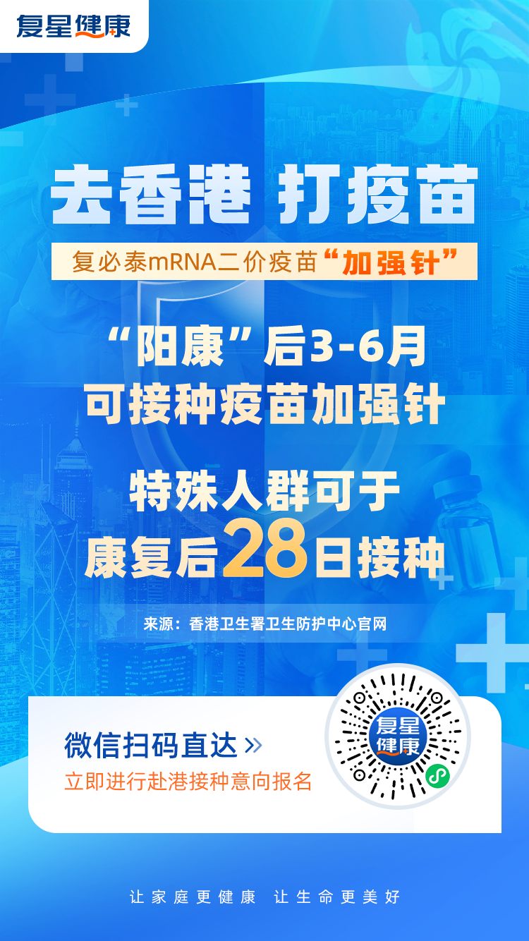 用户可登录复星健康小程序/APP,在首页入口找到“复必泰二价疫苗”,或打开京东APP搜索“复必泰加强针”、支付宝App搜索“阿里健康疫苗”,即可进行个人赴港接种意向报名。待客服短信通知报名成功后,用户可前往香港自费接种复必泰二价疫苗。