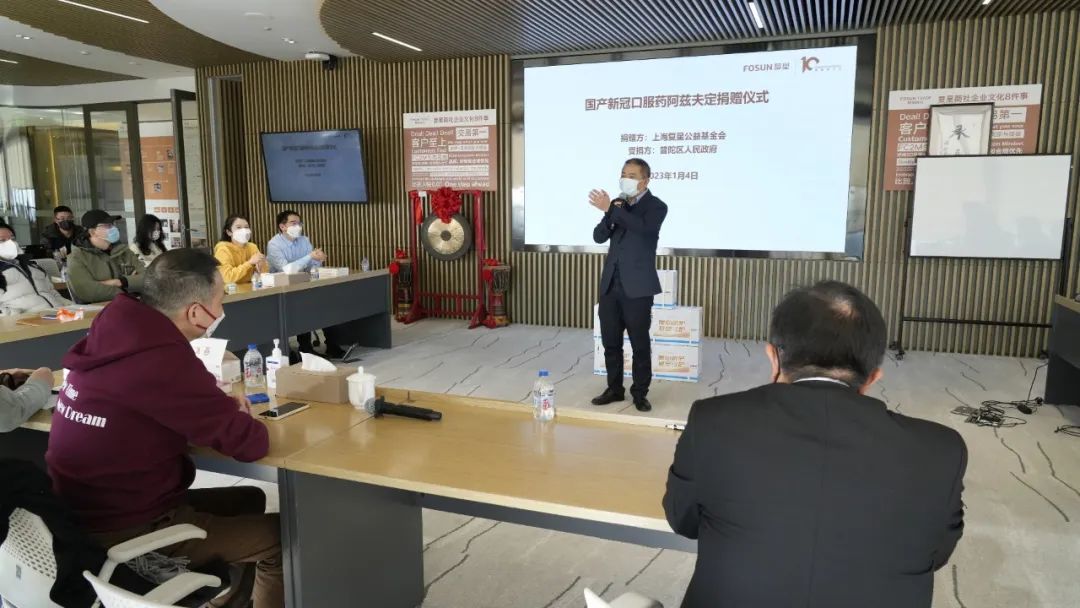 1月4日,上海复星公益基金会(以下简称“复星基金会”)向上海市普陀区合作交流办捐赠1000瓶国产新冠口服药阿兹夫定片,用于缓解云南省昭通市当地医疗物资紧缺情况。普陀区合作交流办主任唐建辉、复星基金会理事长李海峰、复星党委书记祝文魁等出席捐赠仪式。