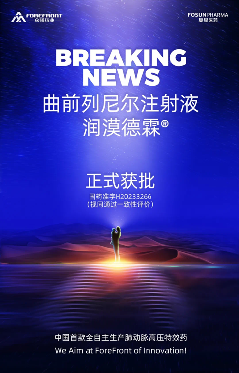 3月16日,复星医药独家商业化的肠外前列环素类似物:曲前列尼尔注射液(商品名:润漠德霖®)获国药监批准。肠外前列环素类似物是国内外指南的重点推荐,用于治疗肺动脉高压,以减轻劳累诱发的呼吸困难、胸闷、胸痛、晕厥、干咳、恶心、呕吐等进行性右心功能不全症状。曲前列尼尔注射液的获批,为肺动脉高压患者带来新选择,帮助中危至高危患者缓解症状,延长寿命。