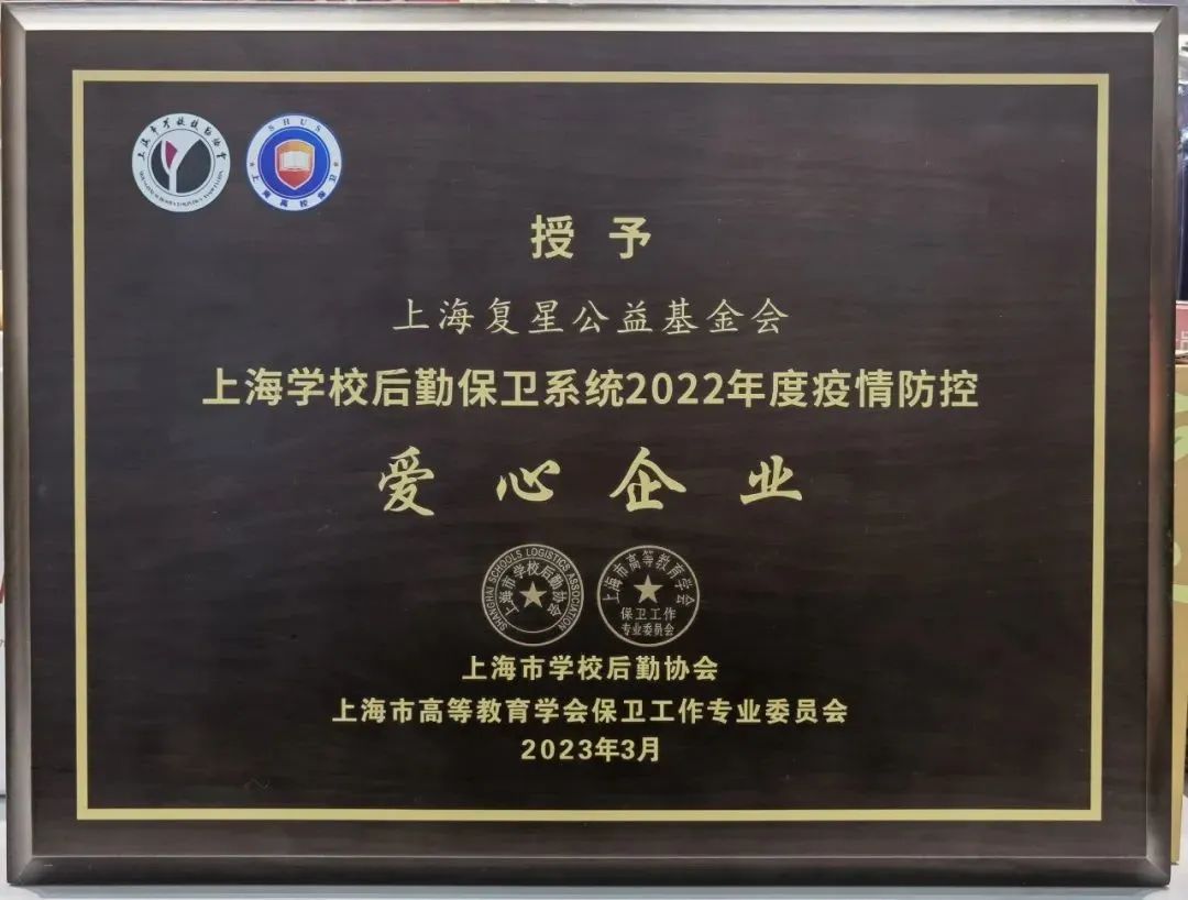 3月28日,第五届上海学校后勤保卫系统“绿叶奖”表彰活动在复旦大学举办,上海复星公益基金会被授予“上海学校后勤保卫系统2022年度疫情防控爱心企业”称号。