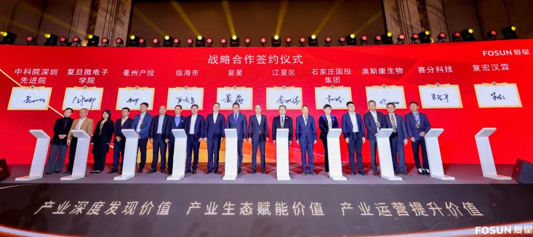 峰会期间,临海市、武汉市江夏区、石家庄国投、亳州产投、复旦大学微电子学院、中科院深圳先进技术研究院、澳斯康生物、赛分科技等,共同与复星签署战略合作协议,临海市委书记吴华丁、江夏区区长舒贵传、复星国际董事长郭广昌等共同见证签约。