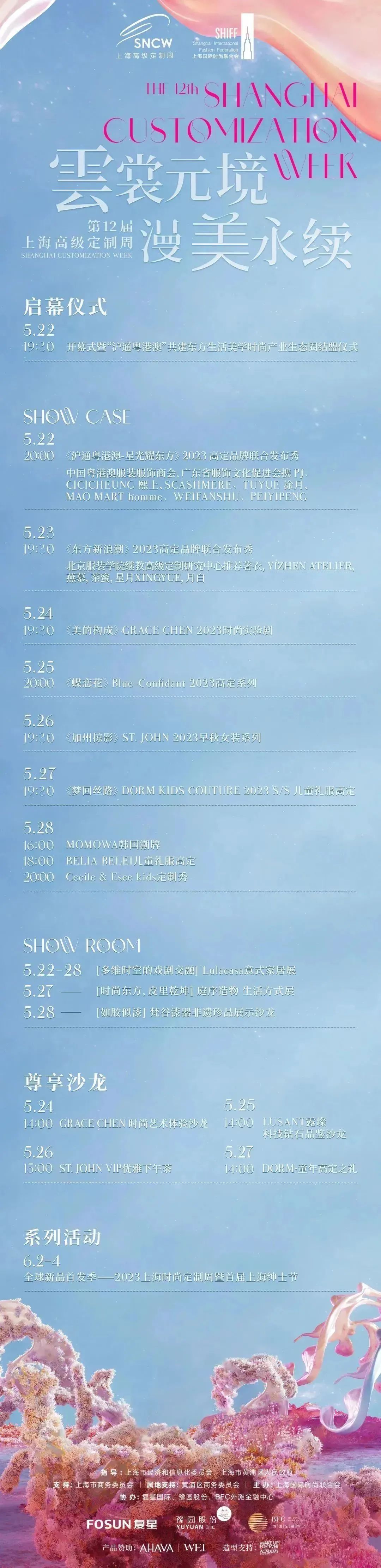 为期一周的高定周,多个知名品牌将带来旗下设计新品的重磅首发, 5月23日,著衣、YIZHEN ATELIER、燕慕、荼蜜、星月XINGYUE、月白等品牌的高定设计师将联合发布《东方新浪潮》;5月24日,GRACE CHEN 将发布《美的构成》2023时尚实验剧;5月25日,Blue-Confidant 将发布《蝶恋花》2023高定系列;5月26日,ST. JOHN将发布《加州掠影》2023 早秋女装系列;5月27日,DORM KIDS COUTURE 《梦回丝路》2023 S/S 儿童礼服高定发布;5月28日,韩国潮牌MOMOWA、儿童礼服高定品牌 BELIA BELEI 以及Cecile & Esee kids将联合带来闭幕秀。除了动态走秀,Lulacasa意式家居、庭序造物、梵谷漆器非遗珍品等将带来各自主题展陈,GRACE CHEN、LUSANT露璨、ST. JOHN、DORM KIDS COUTURE还将举办主题沙龙。