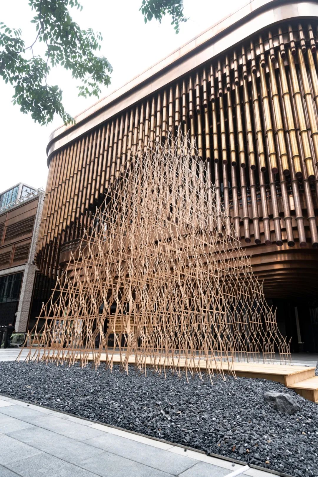 本次展览以“竹”为序章,走进上海复星艺术中心一层展厅,入口处是隈研吾全新设计的装置作品《竹涧》,重现了隈研吾内心深处描绘的“原风景”——上万只竹条由可再生、可重复组装的构件所连接,竹的柔韧与重力形成绝妙的平衡,形成竹的曲线,浮于空中。
