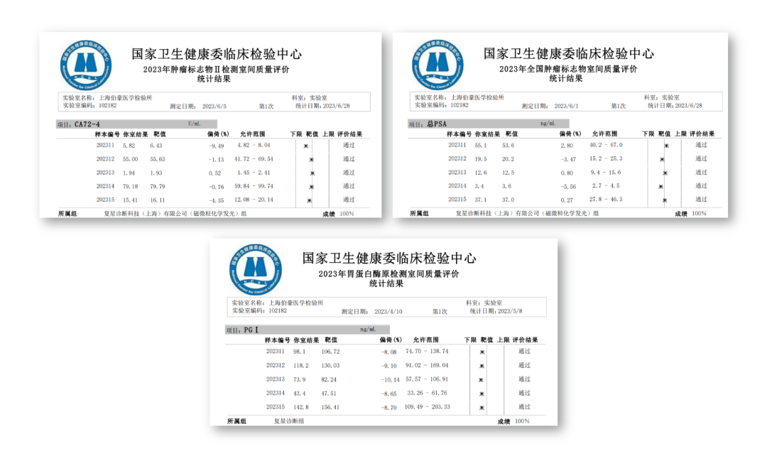 近日,复星诊断化学发光肿瘤标志物系列检测产品(肿瘤标志物/肿瘤标志物Ⅱ/胃蛋白酶原)参加国家卫生健康委临床检验中心室间质评,均以满分的成绩通过,彰显出复星诊断系列产品高度稳定、安全可靠的优势特点。