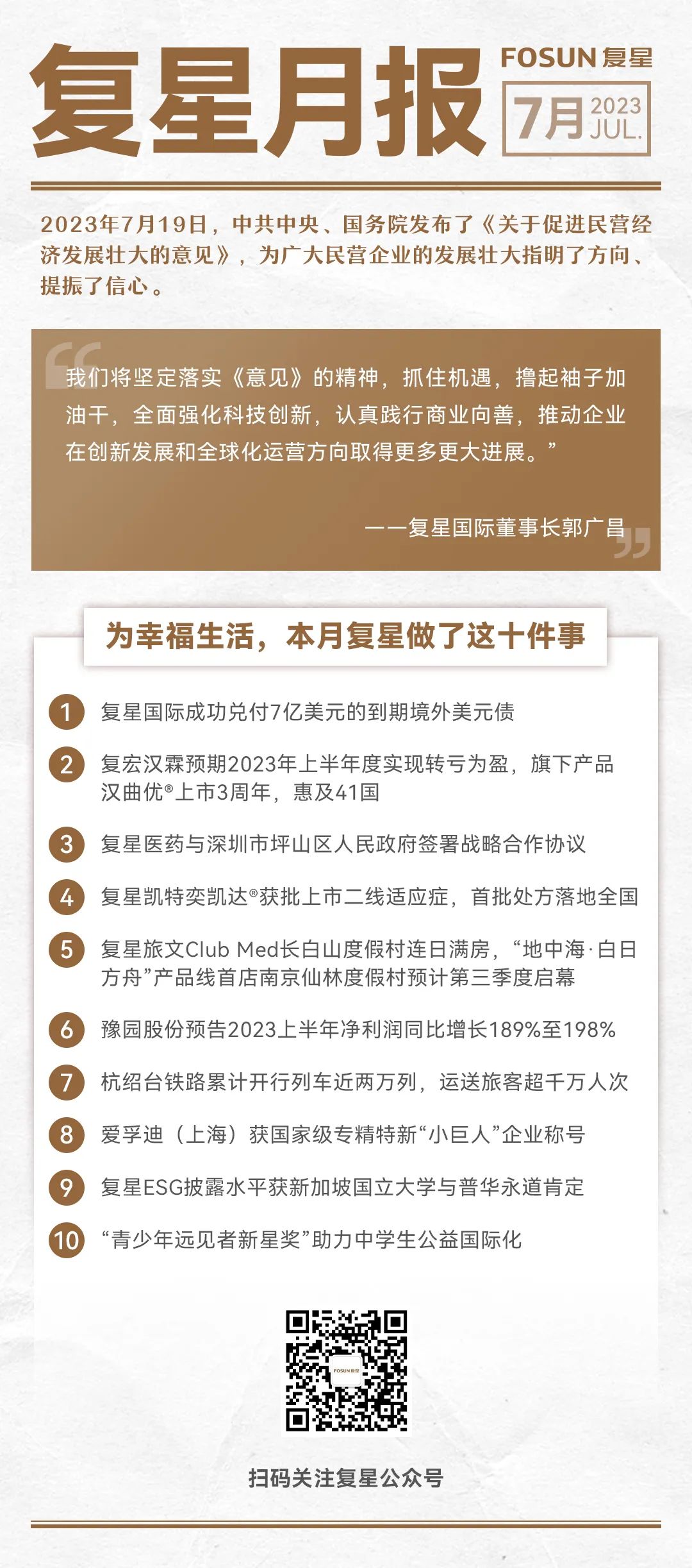 本月复星大事件就汇报到这里啦。下月复星继续努力,持续做有价值的事,与全球家庭一起共创幸福、共赴美好!
