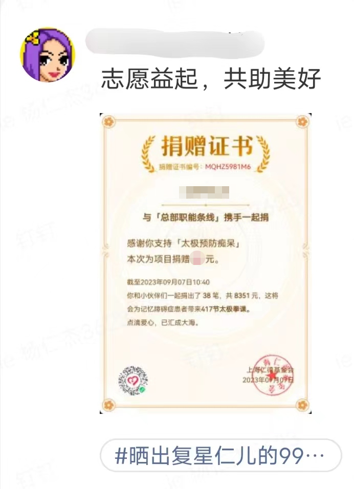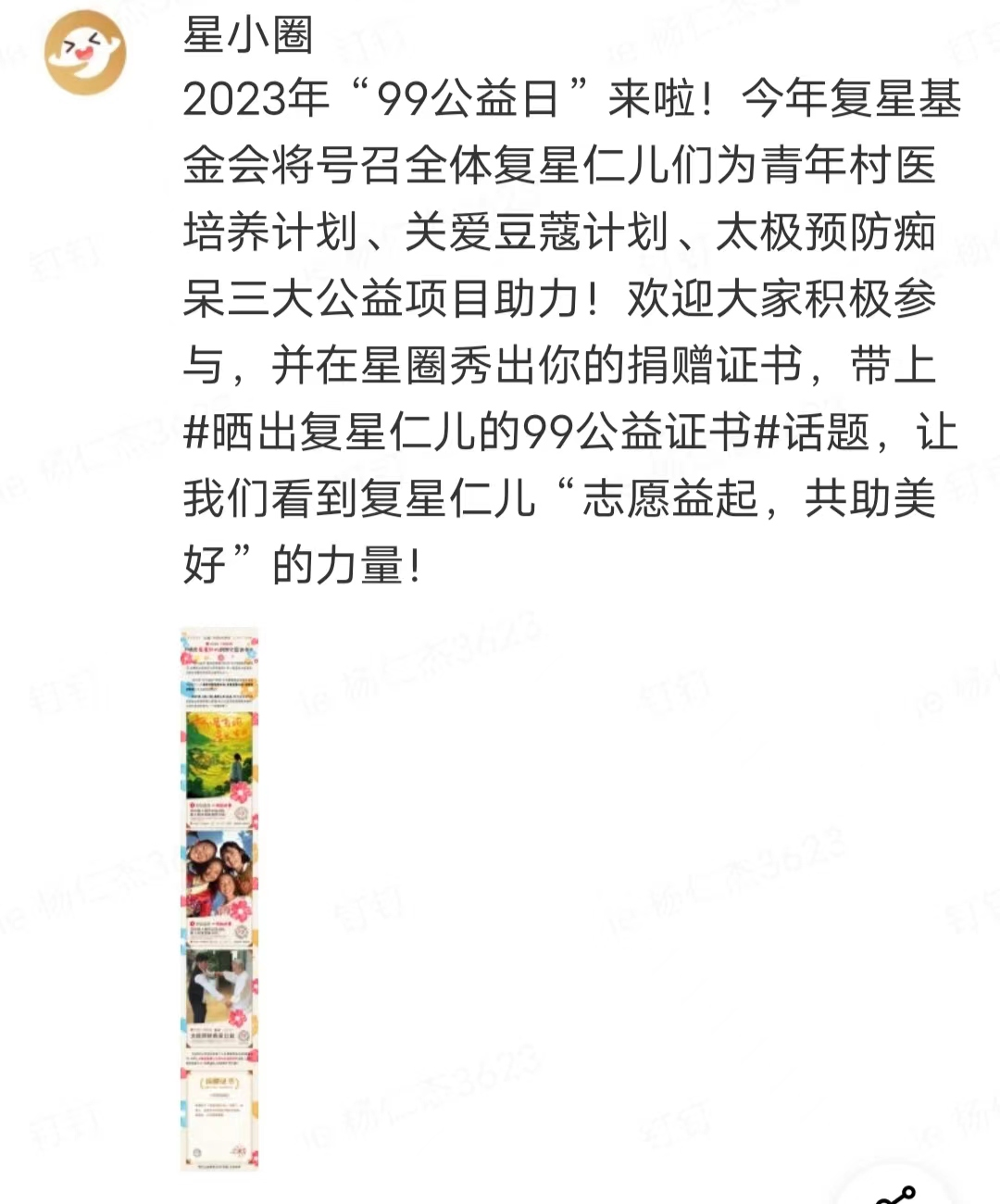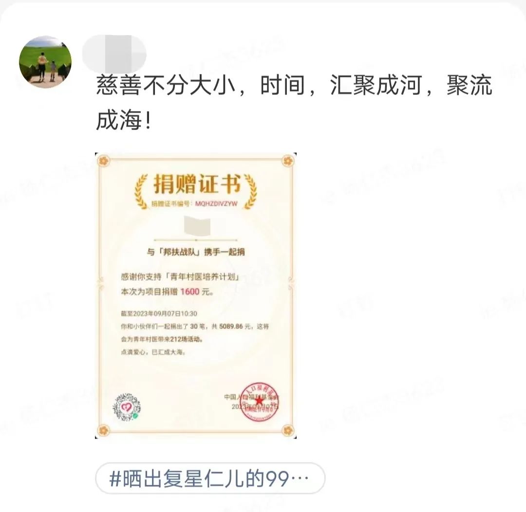 ● 上海复星公益基金会(下称“复星基金会”)、星益家、六星计划、星圈联合发起#晒出复星仁儿的99公益证书#活动: